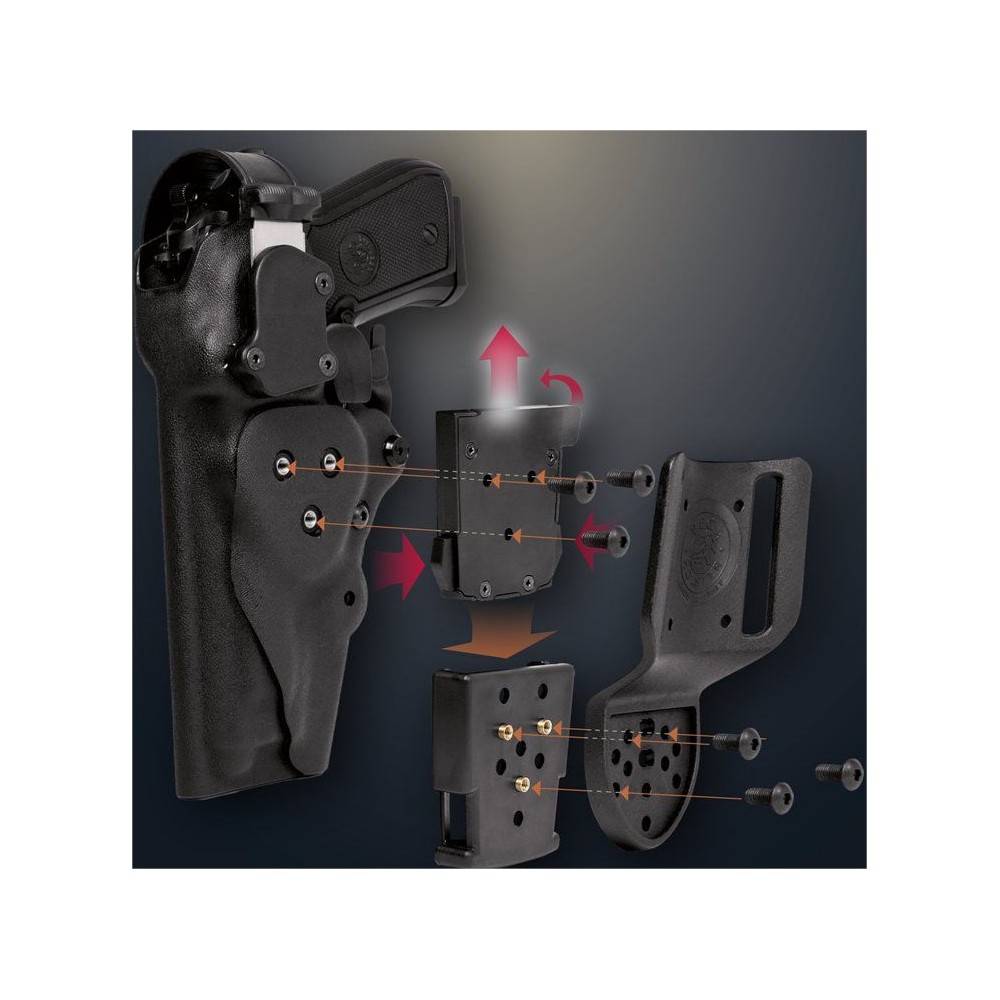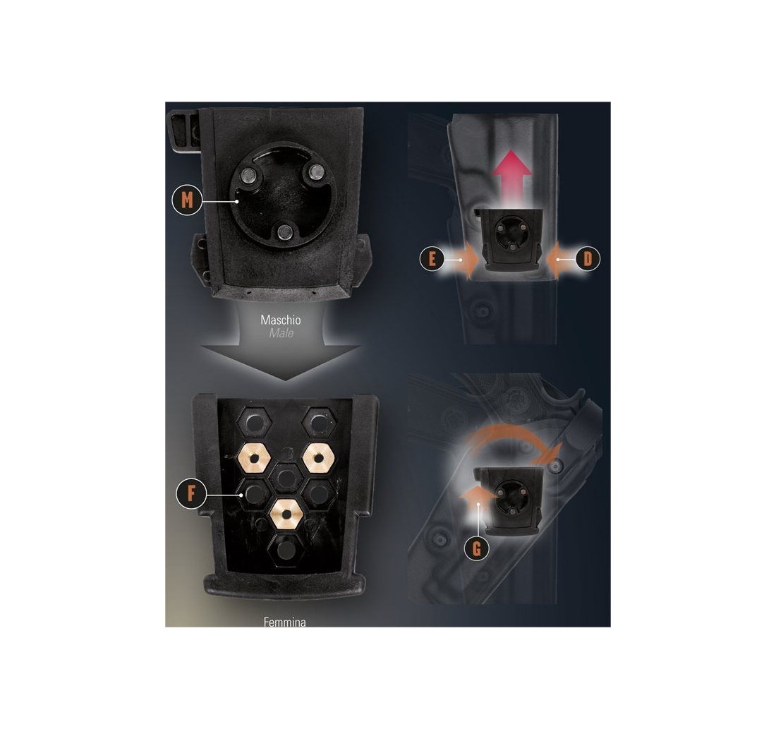 Il sistema è composto da due parti una M (maschio) fissata sulla fondina e l’altra F (femmina) fissata sul passante, piattaforma cosciale o piattaforma Molle (per schema di montaggio, passanti e fondine compatibili).