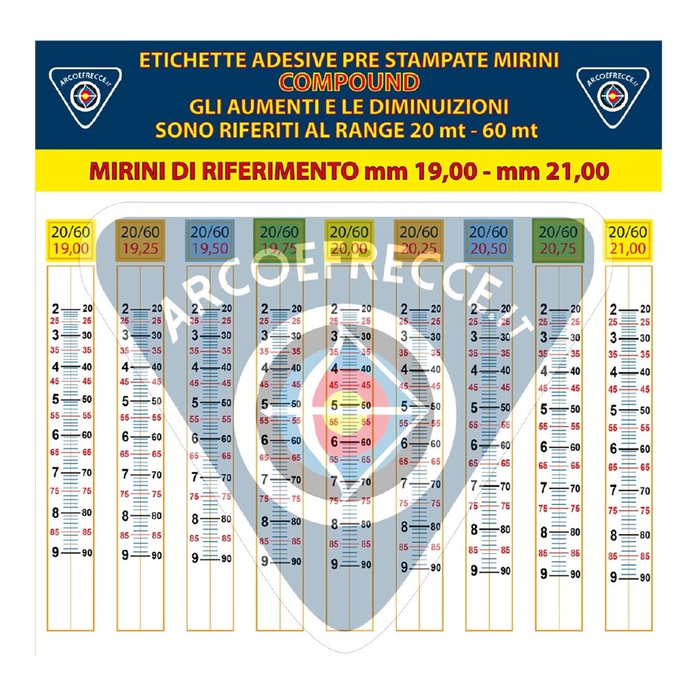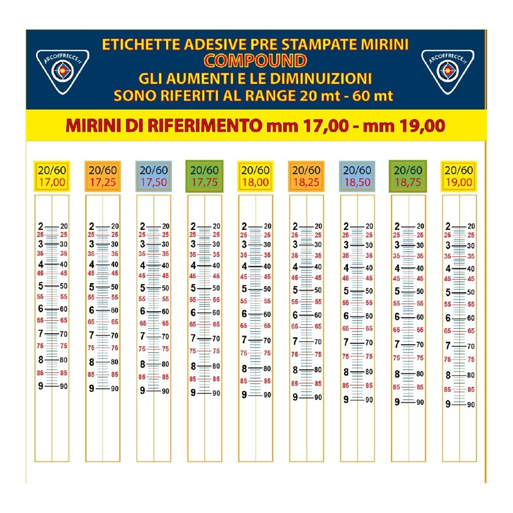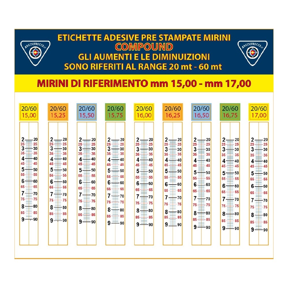 E' sufficiente che l'arciere faccia i mirini in modo accurato a 20 mt. e a 60 mt. Calcolando la distanza sulla scala tra queste due misure sarà abbastanza facile scegliere il kit di etichette più appropriato. Consigliamo di scegliere un kit che lasci la possibilità di utilizzare scale più "allargate" e più " compatte" (per es. se la vostra distanza tra i 20 mt. e i 60 mt. è 16,00 mm. vi consigliamo la scala da 15,00 a 17,00 mm. per poter comunque trovare l'etichetta appropriata anche in caso di leggere diminuzioni/aumenti di libraggio con conseguenti aumenti/diminuzioni dell'intervallo 20/60 mt.).