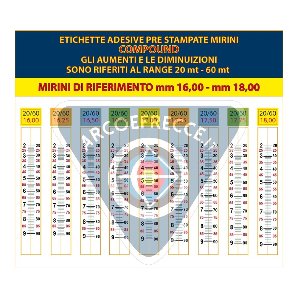 Kit di 9 etichette a colori prestampate per mirini compound. Le 9 diverse etichette si differenziano l'una dall'altra di 0,25 cm. ed hanno le misure di metro in metro segnalate in modo estremamente dettagliato e preciso. I kit sono disponibili in 4 diverse misure (15/17 mm. - 16/18 mm. - 17/19 mm. - 18/20 mm.) per poter coprire le esigenze più disparate (dal compound ultraveloce per il tiro 3D a quello più tranquillo per il tiro alla targa).