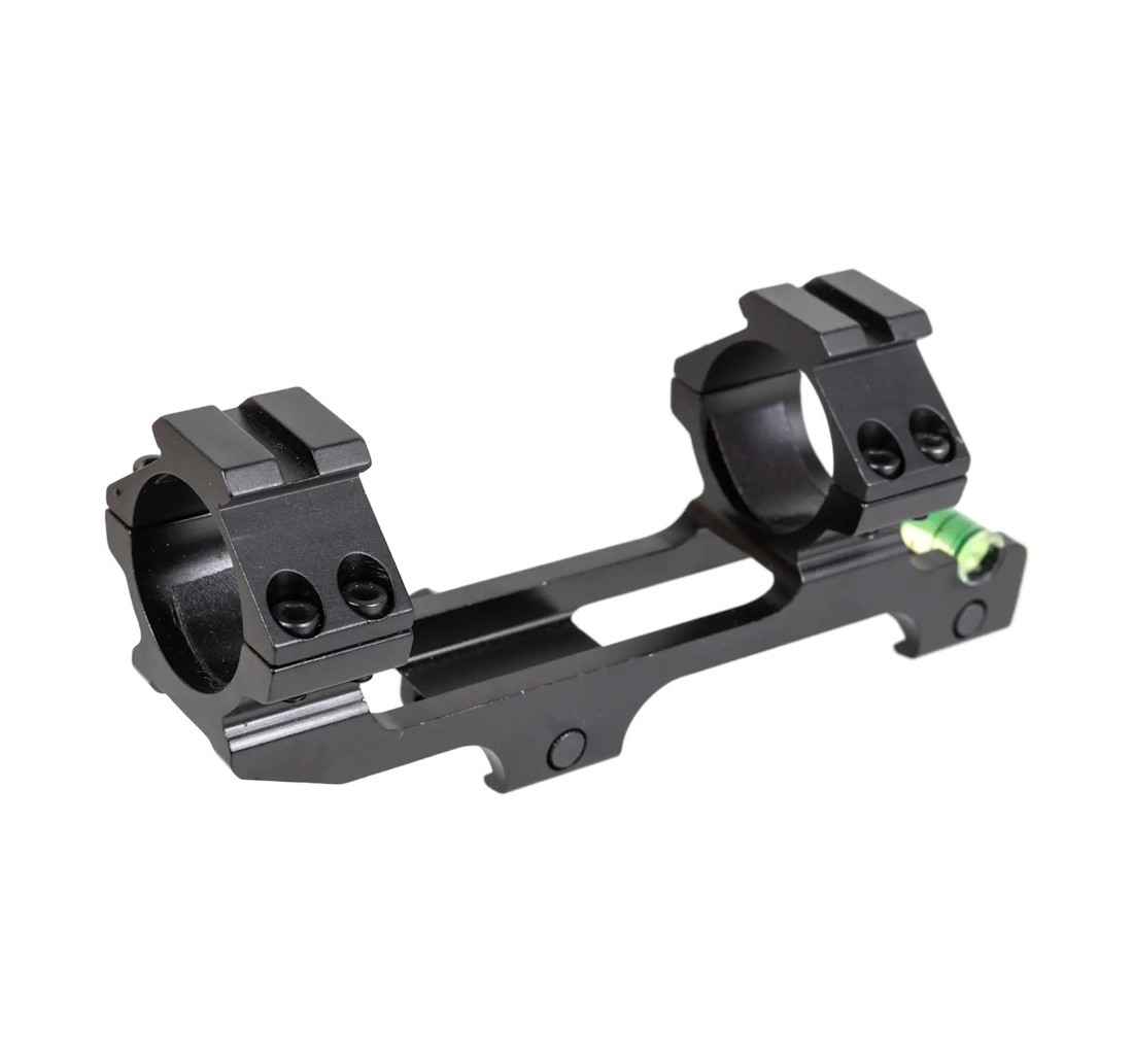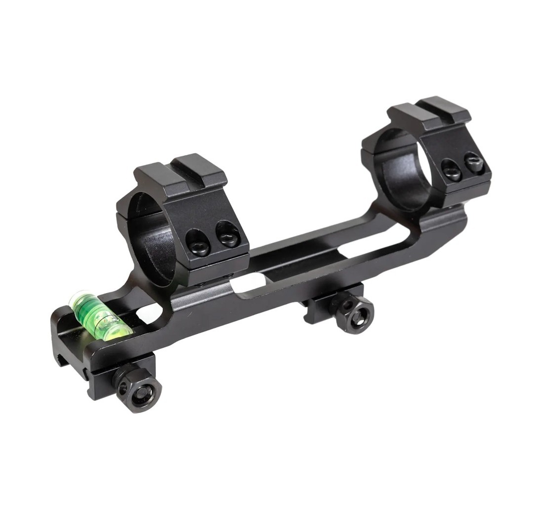 Attacco monoblocco cantilever in lega di alluminio full metal, progettato per il montaggio di ottiche su slitte standard da 20 mm. Compatibile con ottiche da 30 mm e 1 pollice, grazie al riduttore incluso.