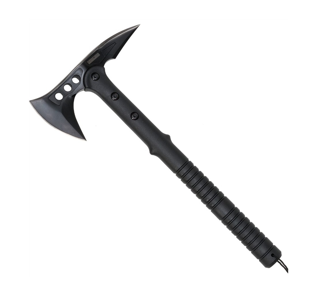 Tomahawk tattica nero. Lama in acciaio inossidabile 420, con rifinitura nera. Impugnatura in robusta fibra di nylon. Dotata di custodia in nylon. Lunghezza totale 380 mm Larghezza lama 190 mm Peso 580 g
