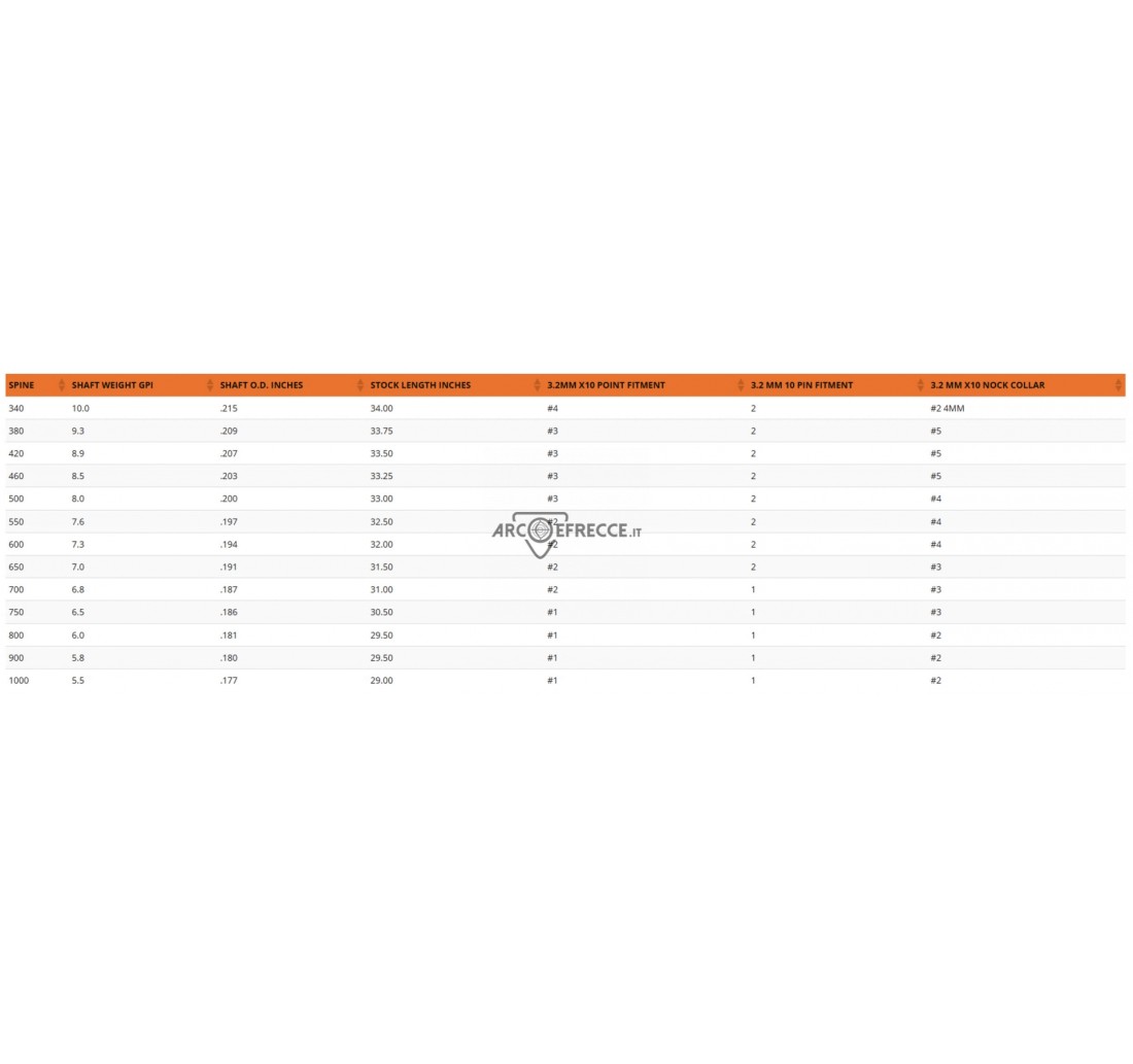 Per quanto riguarda il compound la scelta dello spine rispetto alle x-10 protour rimane invariata, per quanto riguarda il'arco ricurvo si consiglia di scegliere uno o due spine più morbidi rispetto alle X-10.