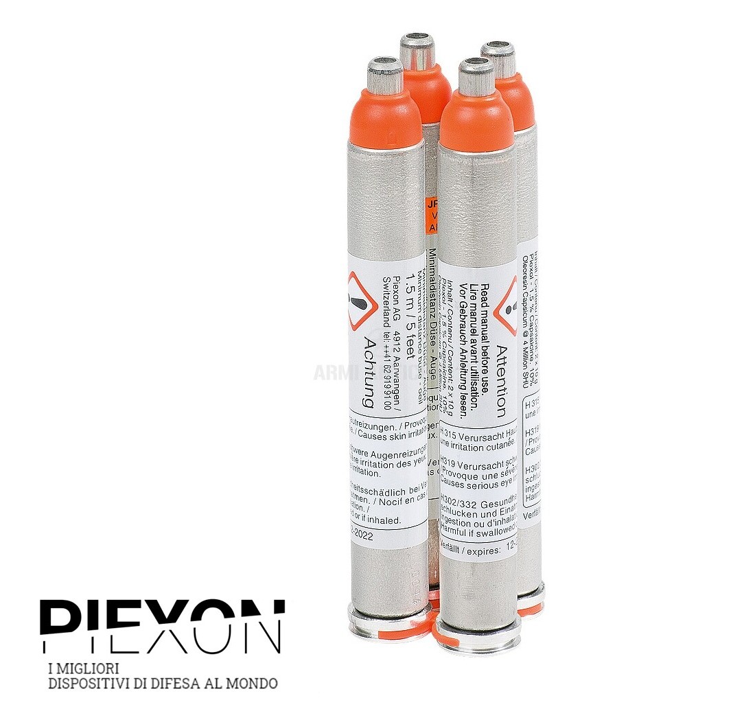 Le Cartucce Piexon consentono di ricaricare la tua JPX4 e contengono un principio di peperoncino (OC) attivo e irritante. La sua soluzione di efficienza debilitante, estrema, è riconosciuta e utilizzata da molti servizi di polizia di stato e vi darà l'opportunità di raggiungere il vostro aggressore fino a 3 metri di distanza (distanza massima consentita dalle leggi e regolamenti Italiani).