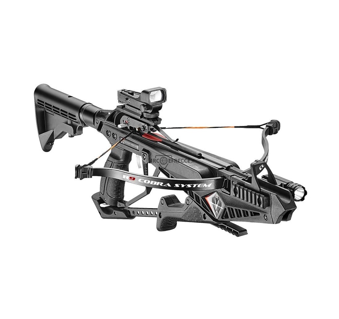 La pistola balestra EK Cobra R9 Deluxe è ricca di accessori e molto curata, tanto da essere equipaggiata con un calciolo tattico per una presa più efficace che migliora la precisione in fase di mira.