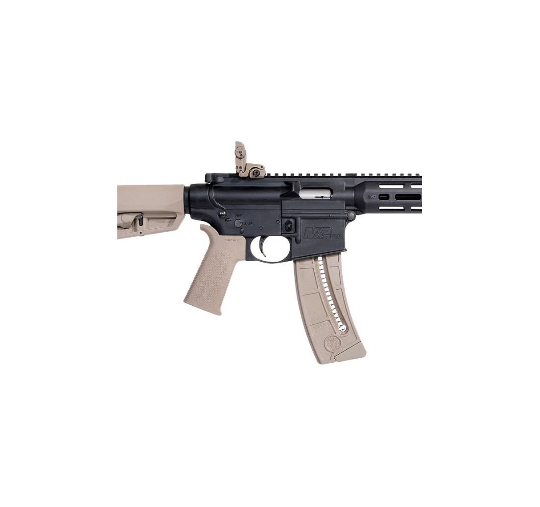 Carabina semiautomatica M&P 15-22 MOE SL, con calcio CaR15 regolabile fino a 6 posizioni, versione FDE, slitta Picatinny superiore a tutta lunghezza, ulteriore porzione di Picatinny sotto l'astina, mire abbattibili.