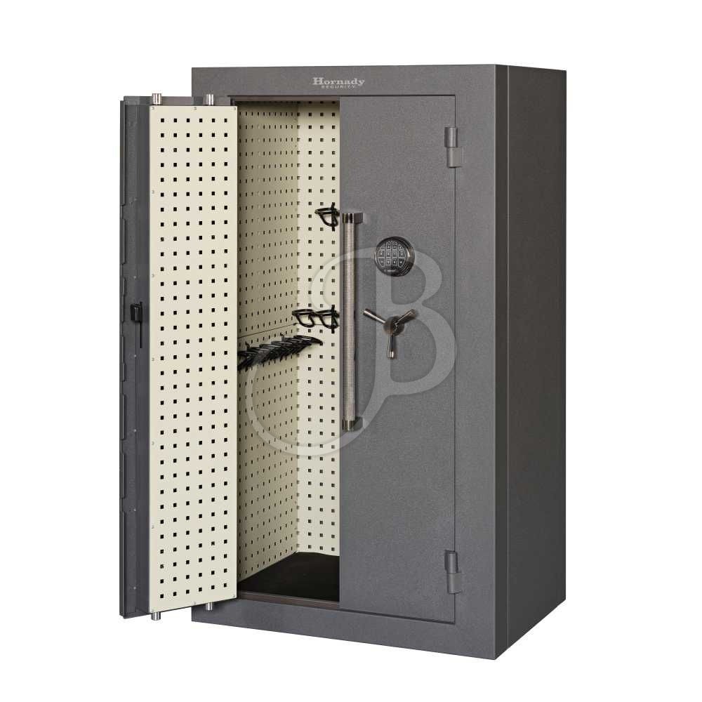 Spesse pareti esterne in acciaio a doppio strato da 3 mm con porta in acciaio massiccio da 4,8 mm resistente agli atti di forzatura e guarnizione anti-intrusione. Nove o quattordici bulloni di bloccaggio in acciaio da 25,4 mm (a seconda del modello). Protezione Fire Shield a 1260°C per un'ora e guarnizioni della porta attivate dal calore. Resistente finitura in polvere grigio opaco. Maniglie e tastiera eleganti in nichel nero. Serratura digitale UL Listed con backup meccanico a chiave EMP. Pre-forata per il fissaggio a pavimento.
