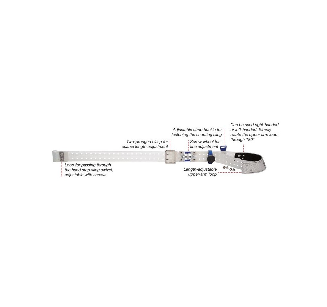 Il passante per il braccio e la cinghia dell'avambraccio vengono fissati tramite una rotella che può essere utilizzata anche per la regolazione fine della lunghezza complessiva quando il fucile è in spalla. Anche la posizione della fibbia della cinghia regolabile per fissare il portaimbracatura all'imbracatura può essere regolata mediante i fori. Grazie alle proprietà del materiale sintetico con l'inserto in fibra di vetro integrato, la cintura da tiro si adatta perfettamente alla posizione di tiro ed è assolutamente indeformabile ed efficiente.