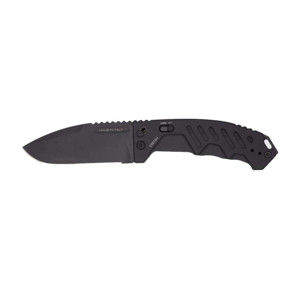 Il meccanismo di blocco in apertura è particolarmente resistente in quanto coadiuvato da un sistema di sicura che lo trasforma in un vero e proprio lama fissa.
