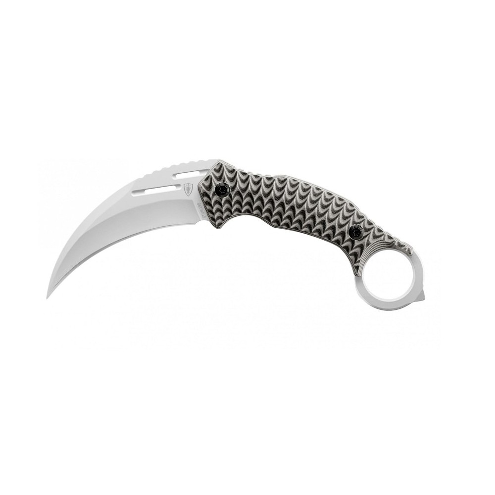 Questo coltello si distingue per la sua forma karambit (simile ad un artiglio) e il motivo bicolore sul manico. Come la maggior parte dei karambit, l'Elite Force EF715 può essere impugnato in due modi. Il modo convenzionale è quello di infilare il mignolo nell'anello e premere il pollice contro il dorso della lama. Con l'impugnatura inversa metti l'indice nell'anello e avvolgi le altre dita attorno al manico. La finitura satinata della lama si estende fino all'intero codolo, che contiene le due guancette dell'impugnatura in G10.
