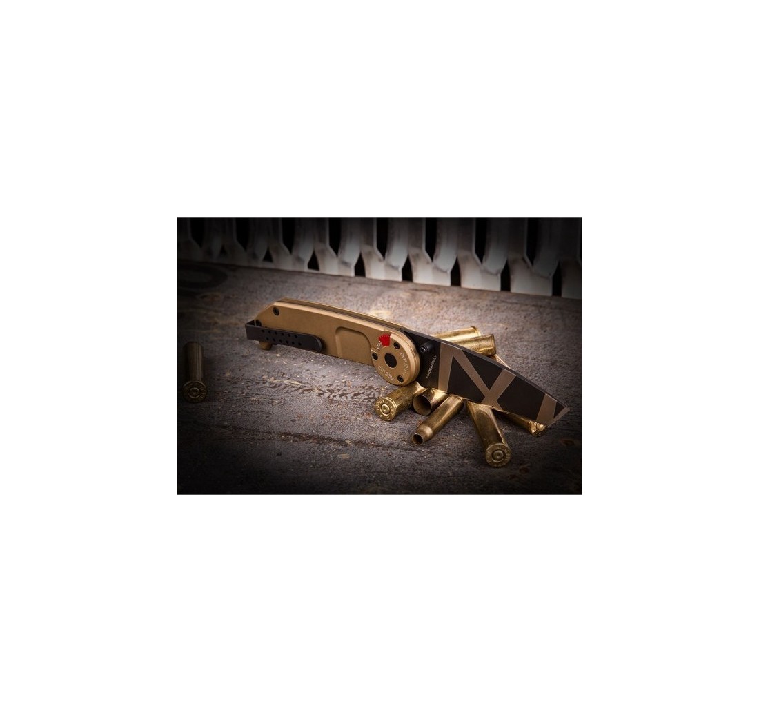 Il meccanismo di blocco della lama è il collaudato LINER-LOCK, coadiuvato da un meccanismo di sicura da azionare manualmente protetto da un carter.