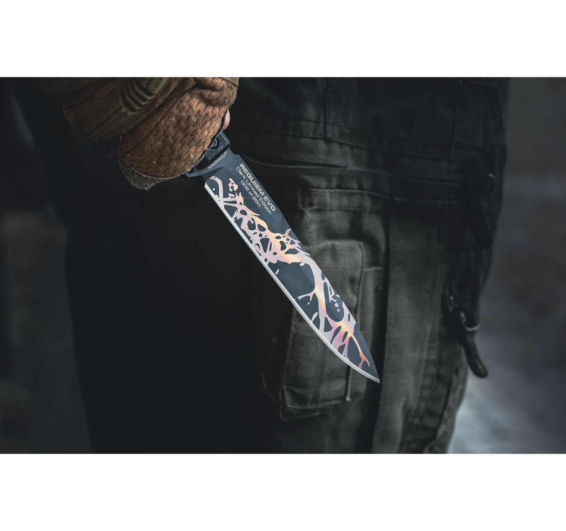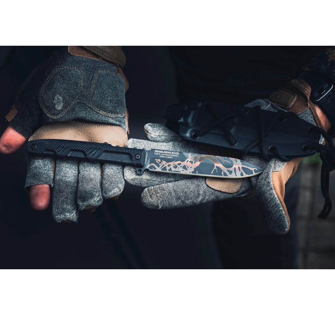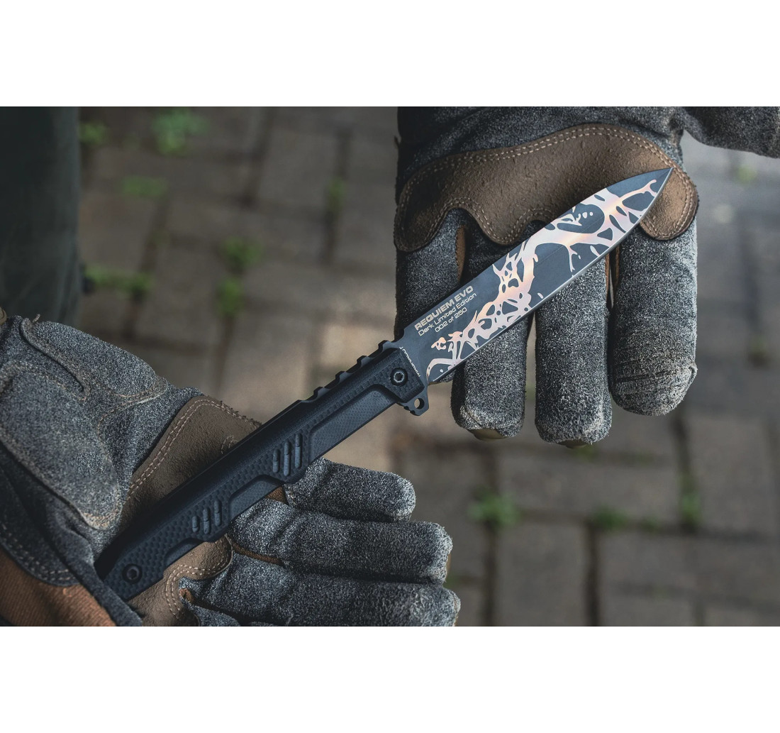 REQUIEM EVO DARK è la versione full tang del celebre Requiem potenziata in ogni aspetto: struttura più robusta, nuovo profilo spear point per una penetrazione superiore e tagli netti, guancette in G10 nero dal design futuristico.