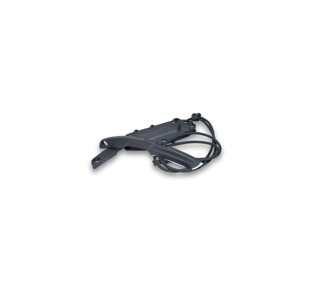 Extrema Ratio N.K.3: è un coltello di dimensioni ridotte che amplia la famiglia dei neck knives Extrema Ratio. Si differenzia dai modelli N.K.1 e N.K.2 per la dimensione maggiore della lama tanto da 70mm, dotata di fresatura scolasangue. L’ergonomia dell’impugnatura è studiata così da evitare tagli accidentali durante l’estrazione dal fodero. Sul dorso è ricavato uno scarico per il posizionamento del dito pollice o indice a seconda dell’utilizzo. La struttura consente l’utilizzo per colpi da taglio molto efficaci oppure per piccoli lavori di precisione. Il fodero in Kydex è a sgancio rapido ed è fornito di paracord per il porto del coltello al collo, e può essere attaccato al sistema MOLLE oppure alla cintura con gli appositi accessori Extrema Ratio (non inclusi).