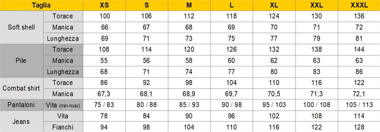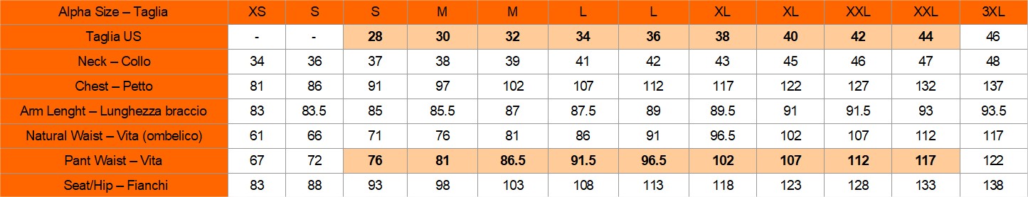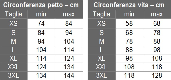 Seguendo queste tabelle potrai capire quale taglia scegliere in base alla tua fisicità.