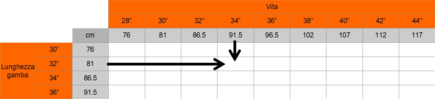 Esempio: Misura 34-32 significa che il giro vita è una taglia 34 (quindi fino a 91,5cm) e la lunghezza del pantalone è una taglia 32 (quindi la gamba è lunga circa 81cm).
