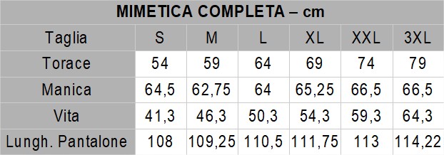 I capi firmati Sturm si basano su misure standard NATO. Giacche e pantaloni hanno una vestibilità molto ampia dato che originariamente una stessa misura doveva coprire più taglie.
