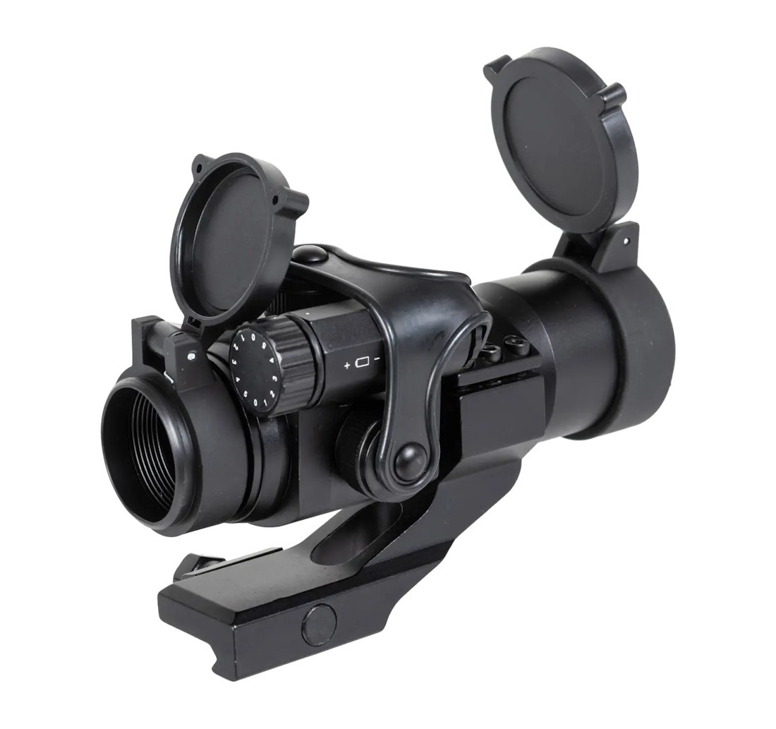 Red dot compatto in duraluminio con finitura opaca, progettato per un utilizzo affidabile su repliche softair. La lente con trattamento antiriflesso garantisce una visione chiara e rapida dell’obiettivo.