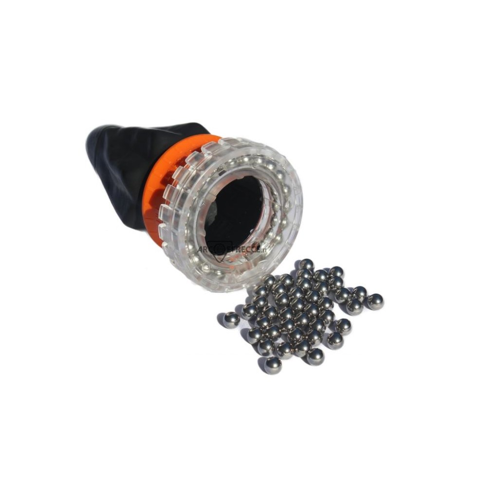 Il caricatore Pocket Shot Speed si avvita sulla parte anteriore di qualsiasi Pocket Shot originale. Contiene 19 sfere d'acciaio (solo 5/16) e le lascia cadere nella custodia quando giri il quadrante.