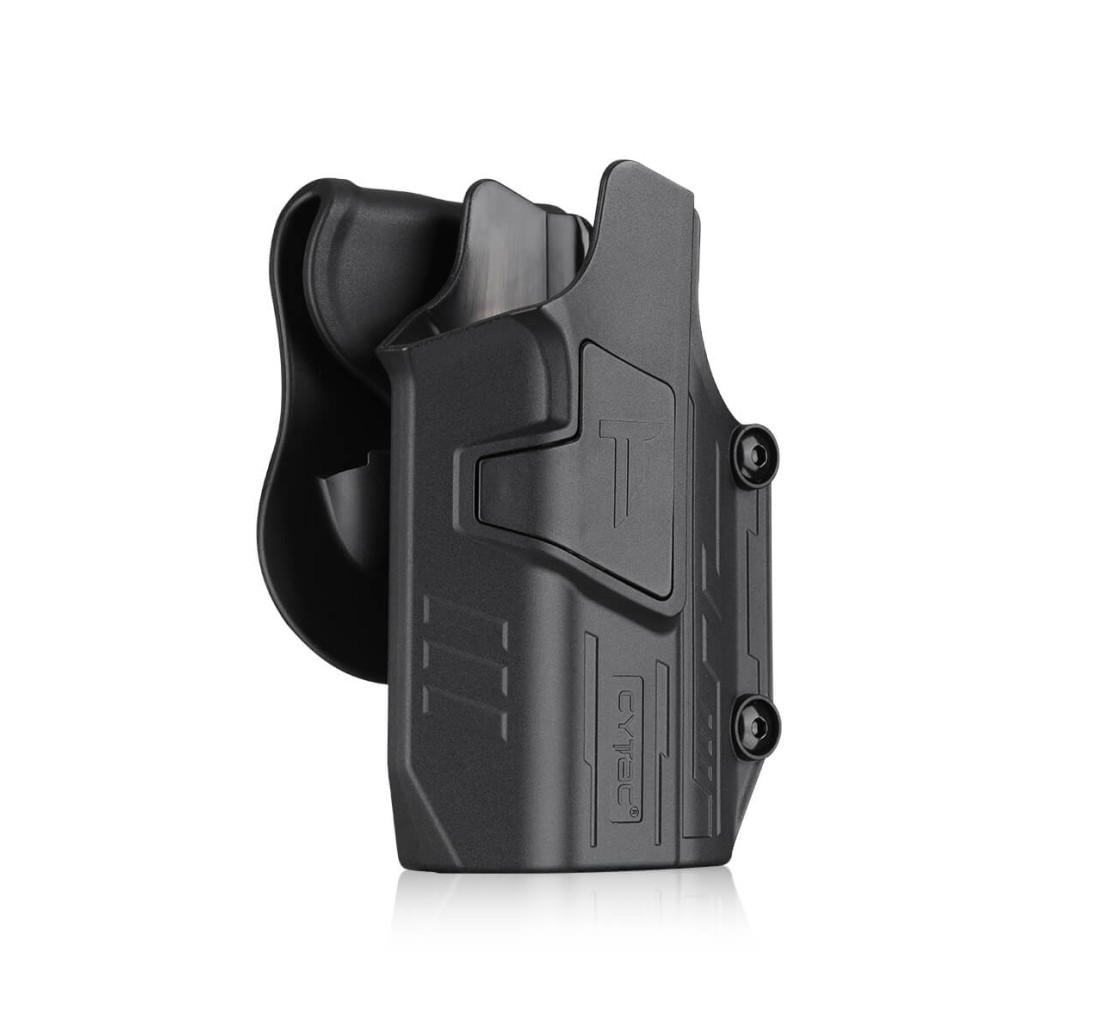 Cytac fondina universale per pistola con torcia. Il supporto Mega-Fit utilizza il classico metodo di sblocco dell'indice per sganciare la vostra arma per un utilizzo più semplice e affidabile. E' stata resa la posizione del mirino anteriore più ampiamente compatibile sia con il layout del mirino anteriore che con la vite semi-automatica strutturale full-size originale.