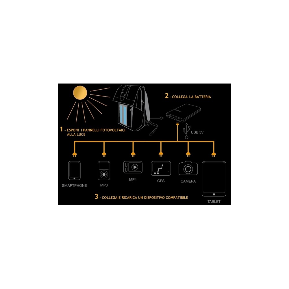 Il pannello esposto alla luce solare o anche a quella artificiale ricarica la batteria attraverso la presa USB: questa energia può essere quindi trasferita al vostro dispositivo da caricare.