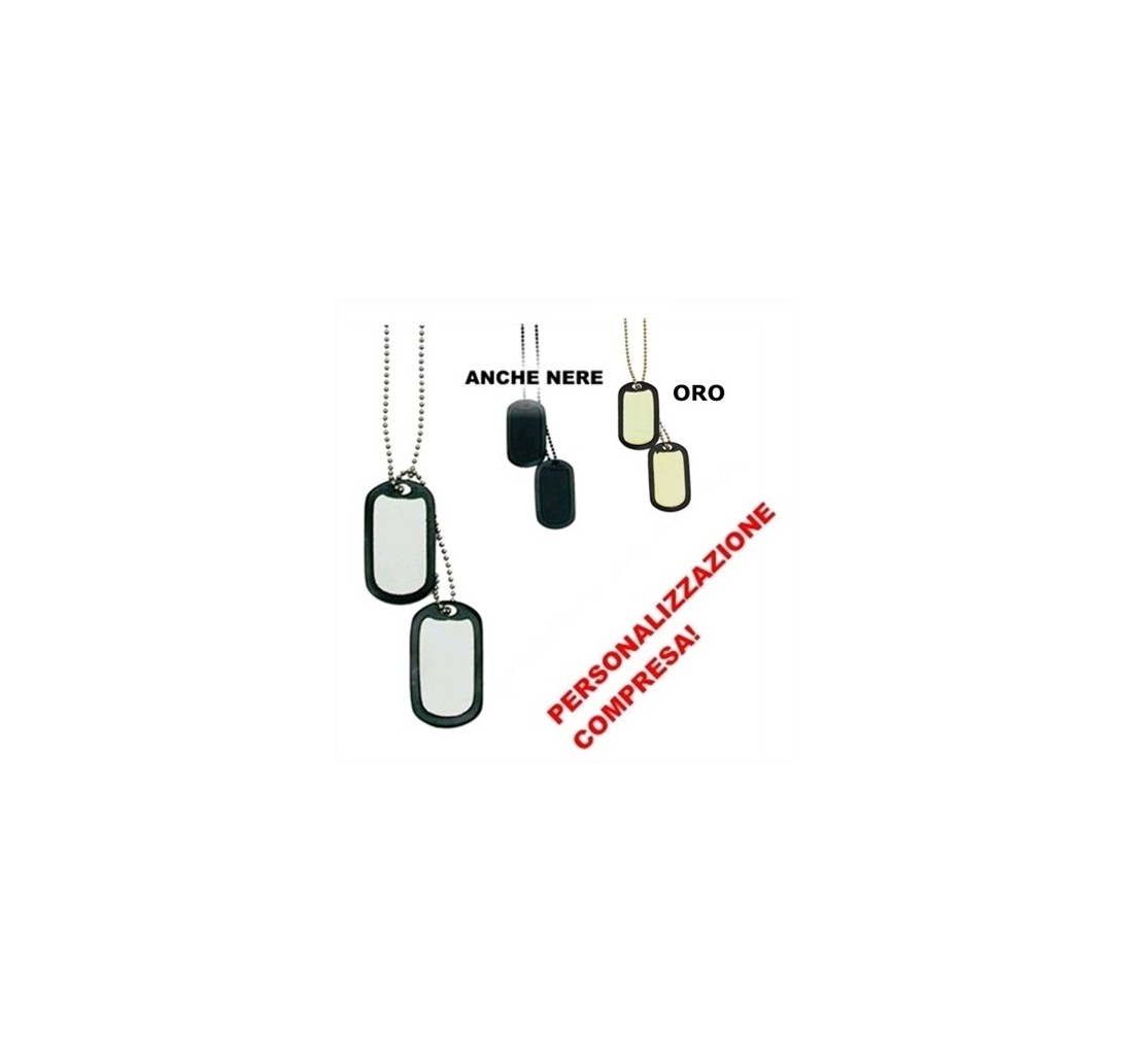 Kit composto da 2 piastrine personalizzabili a piacere (personalizzazione a rilievo inclusa), con protezione in gomma e due catene (corta e lunga). La personalizzazione è possibile su 5 righe massimo per 15 caratteri ciascuna.