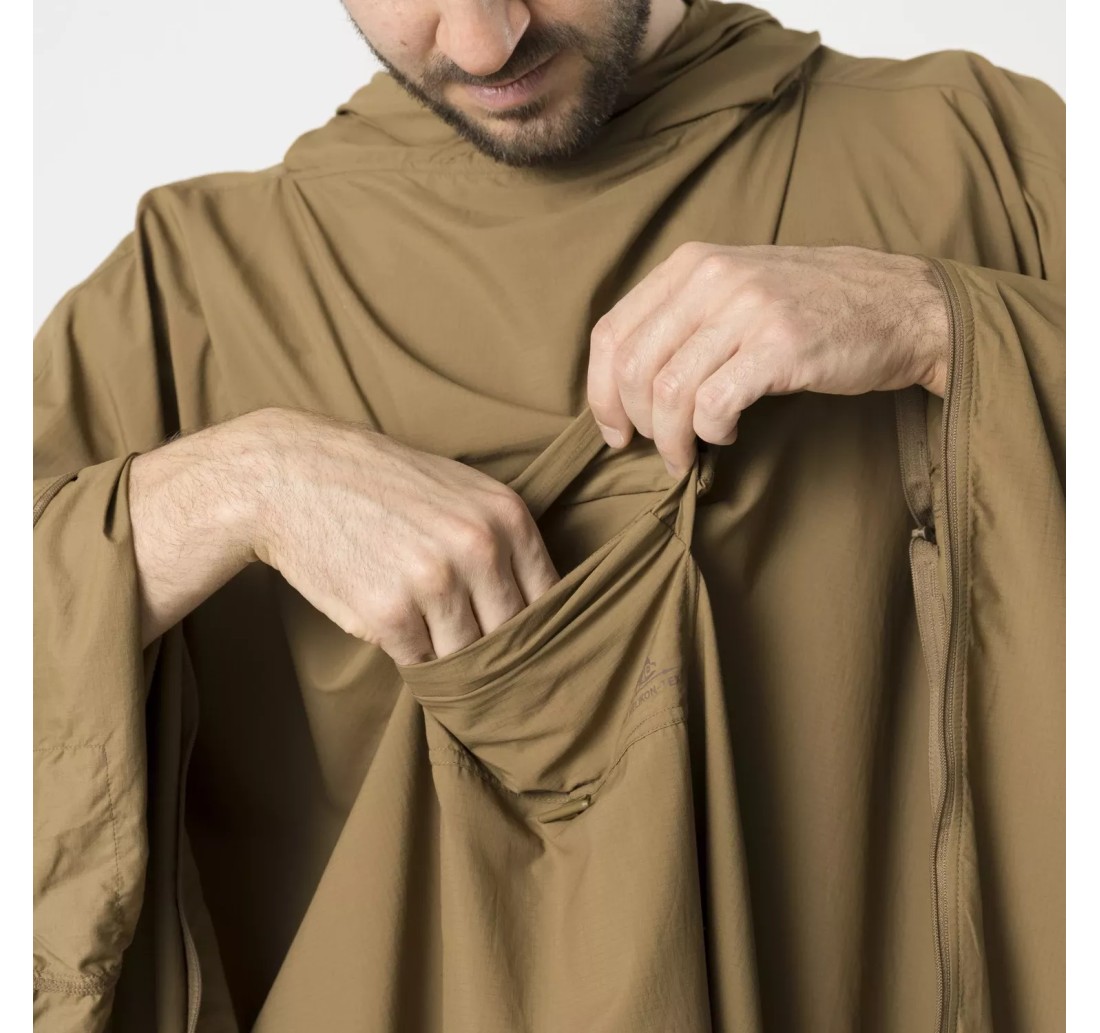 Aperta, diventa un poncho con cappuccio; con i lati fissati può essere usata anche come giacca leggera.