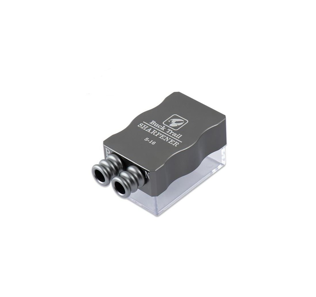 Temperino in alluminio per aste legno. Disponibile in due misure: 5/16" e 11/32". Cono sia per punta che per cocca.