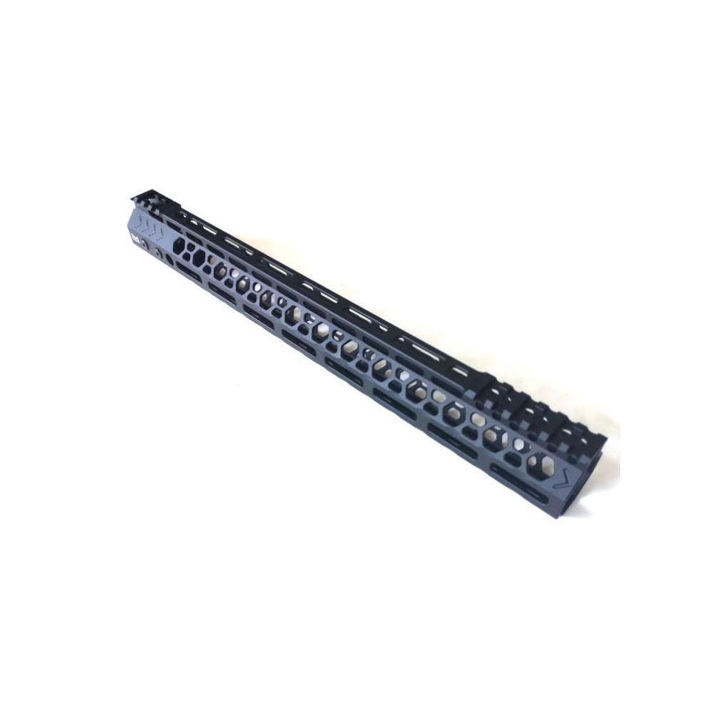 Rail guardamano flottante slim con sistema M-LOK in alluminio anodizzato duro 6061 T6 , diametro interno 34mm, Picatinny parziale superiore 1913 Mil STD con denti anti-rotazione, fornito di sistema fissaggio e bloccaggio canna proprietario.
