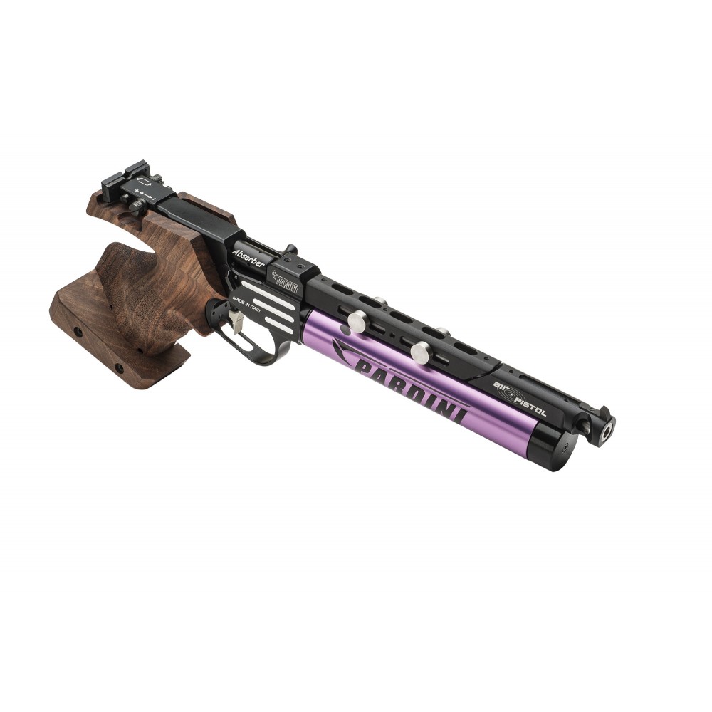 Pistola monocolpo cal. 4,5 (.177) con propulsione ad aria compressa. Innovativo sistema (brevetto PARDINI) di annullamento del rinculo alla partenza del colpo. Sistema di scatto di nuova concezione completamente regolabile con dispositivo per il tiro in bianco. Tacca di mira ampiamente personalizzabile con linea di mira a lunghezza variabile e ampia scelta di mirini intercambiabili.