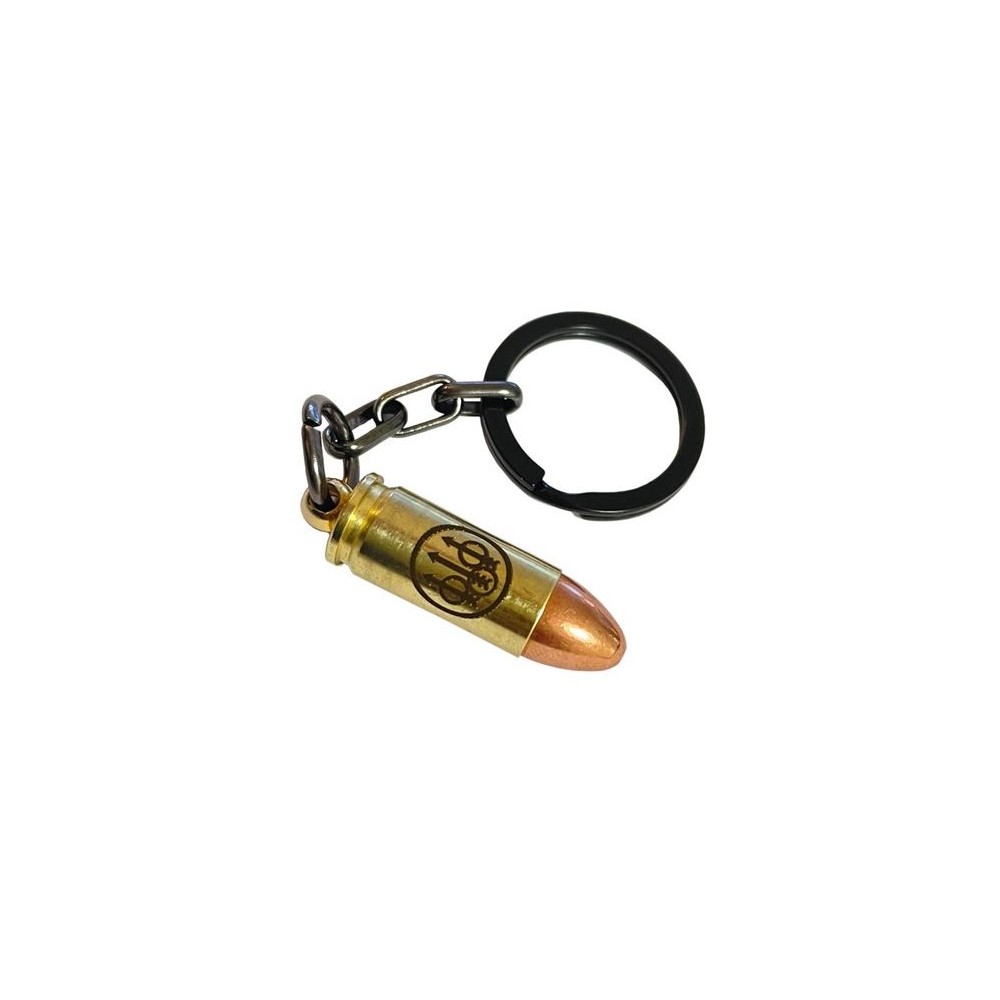 Portachiavi realizzato da un'autentica cartuccia (bossolo e palla) per carabina marca Fiocchi calibro .308 disattivata con logo Beretta inciso a laser, oppure per pistola, in calibro 9x19 disattivata con logo Beretta inciso a laser oppure per per pistola, in calibro 9x21 disattivata con logo Beretta inciso a laser.
