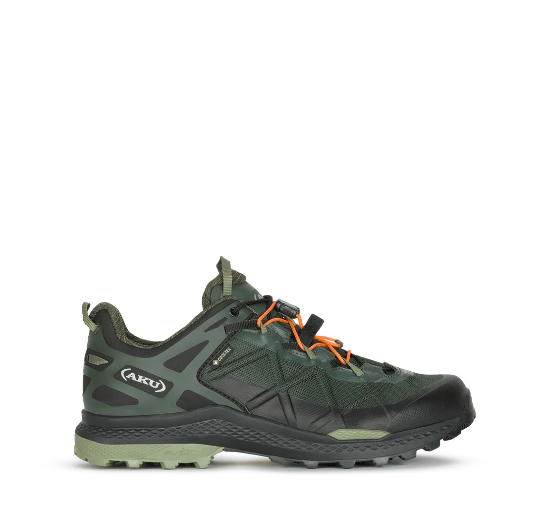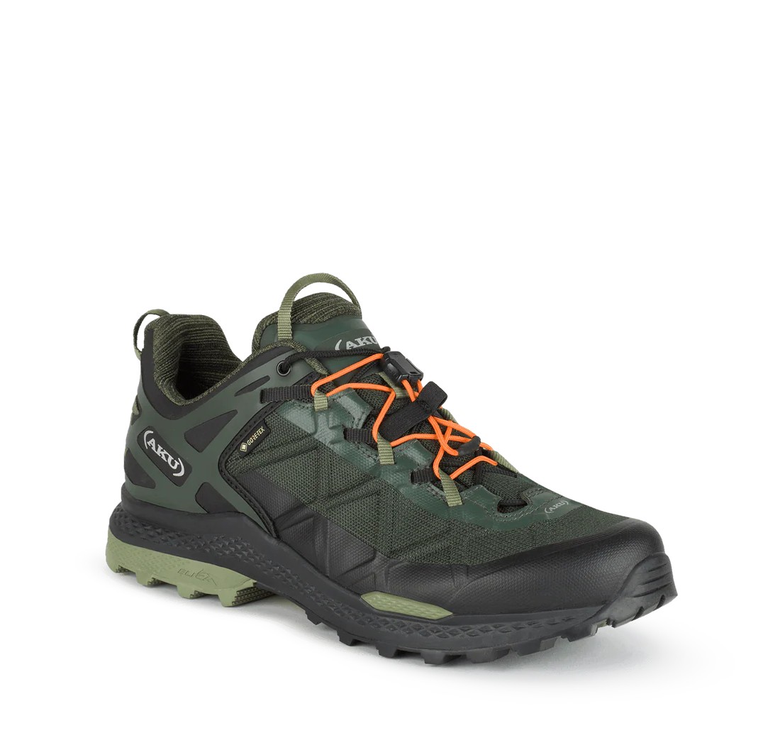 Calzatura destinata all'escursionismo veloce dinamica e affidabile anche sui percorsi più difficili. ROCKET DFS GTX adotta l'innovativo battistrada Vibram con tecnologia Traction Lug che migliora del 25% la trazione e la tenuta grazie allo speciale design. La tomaia ha una struttura a nervature incrociate ed è protetta da uno strato 3D print. La tecnologia esclusiva AKU Dual Fit System (DFS), consente di variare il grado di precisione della calzata agendo con semplicità sui due diversi sistemi di allacciatura. E' costruita con la tecnologia AKU Elica Natural Stride System per favorire l'efficienza biodinamica.