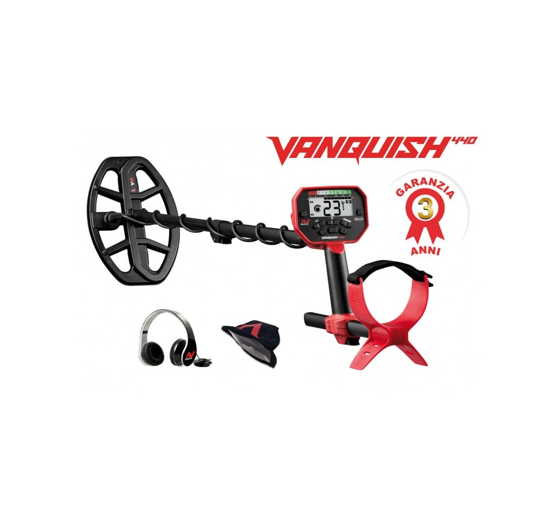 Il VANQUISH 440 è coperto da una garanzia di 3 anni (certificato d'acquisto richiesto). Minelab consiglia la registrazione del prodotto online. La garanzia non copre danni derivanti da uso improprio, negligenza o interventi non autorizzati.