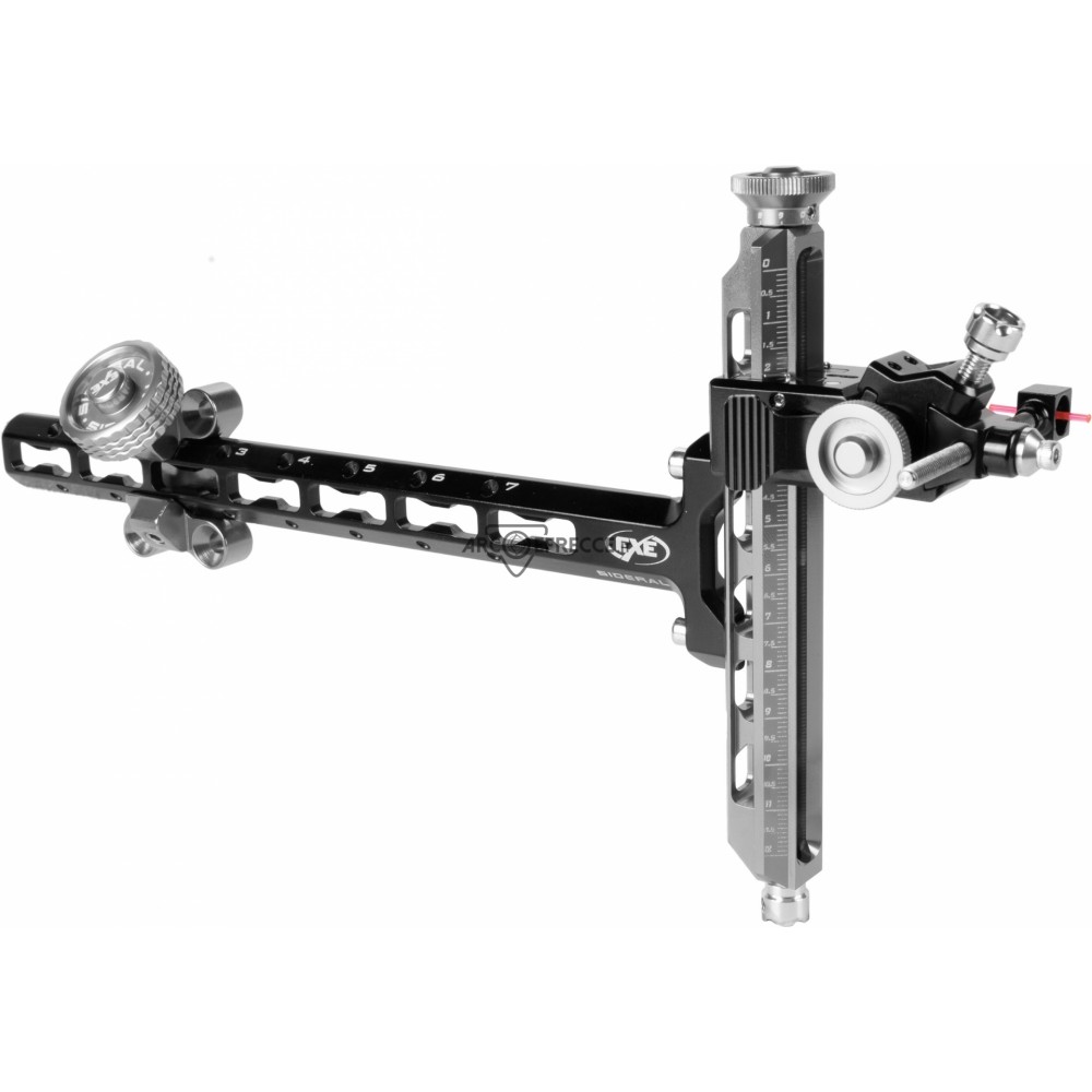 Mirino da tiro per arco ricurvo con struttura in alluminio anodizzato, completo di diottra con sblocco rapido.