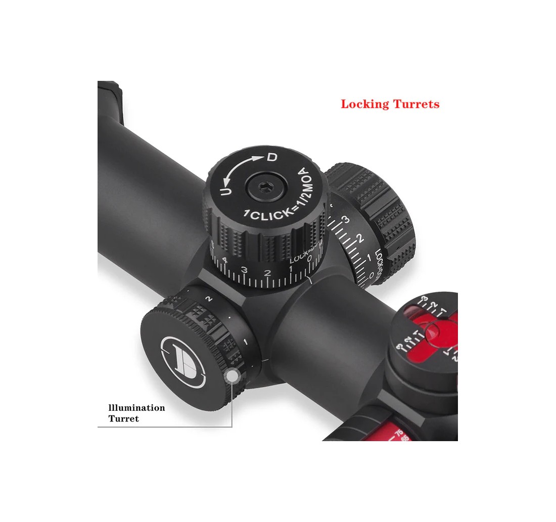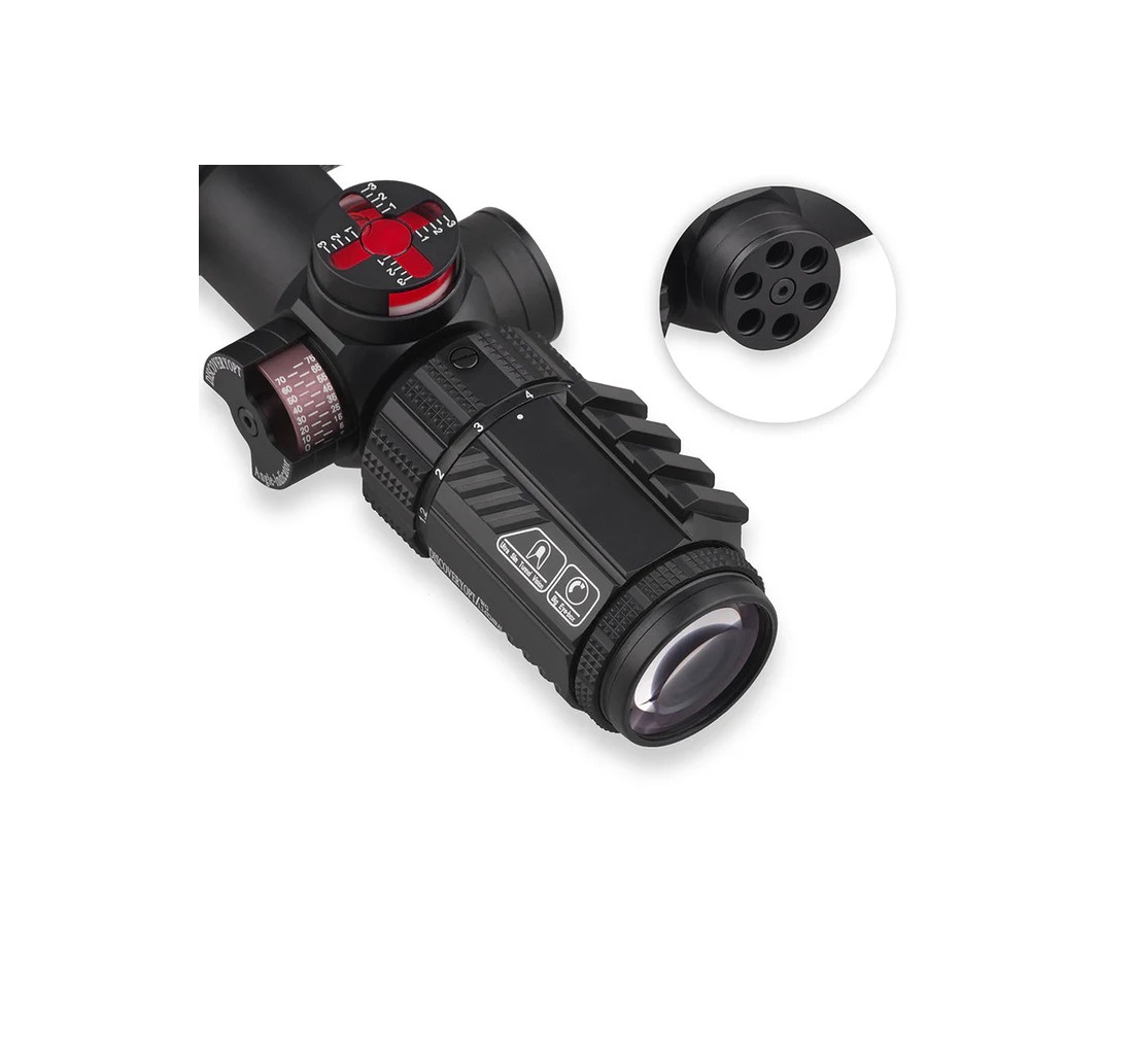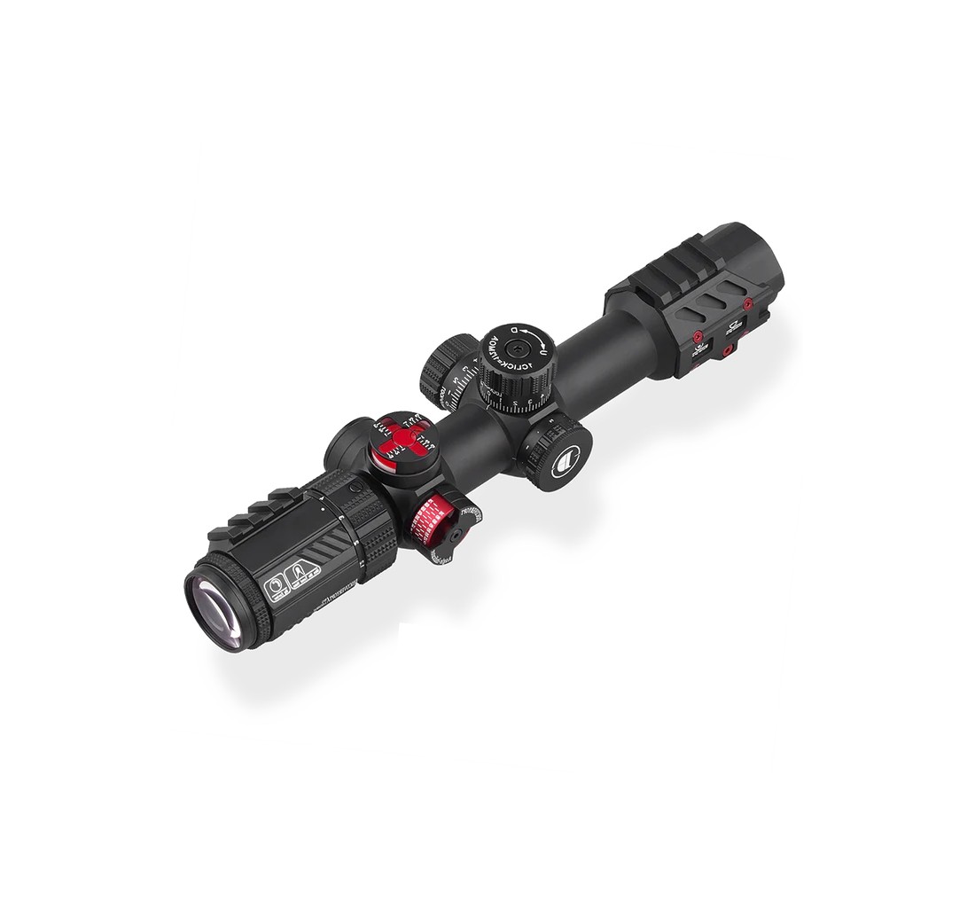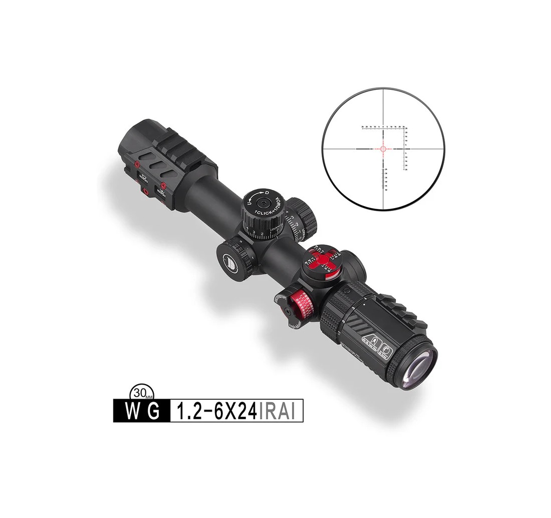 DiscoveryOpt WG 1.2-6X24IRAI è un cannocchiale tattico con tubo da 30 mm, progettato per tiro ravvicinato e medio. Ha ingrandimento variabile 1,2–6×, reticolo illuminato in MOA sul secondo piano focale, regolazioni rapide di elevazione e deriva, corpo robusto waterproof, anti-urto e anti-appannamento con riempimento in azoto, e ottiche multi-rivestite per immagini chiare anche in condizioni di scarsa luce.