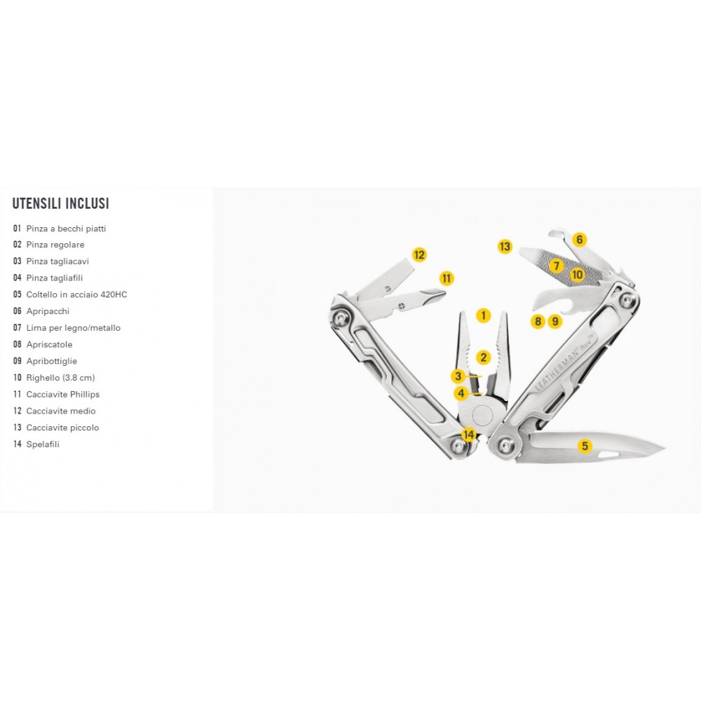 Leatherman pinza multiuso REV, dotata di ben 13 indispensabili utensili, lama in acciaio inox 420HC e pocket clip.