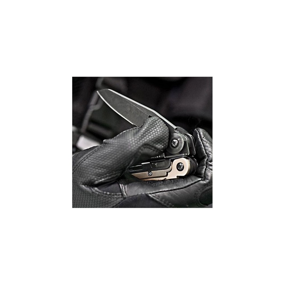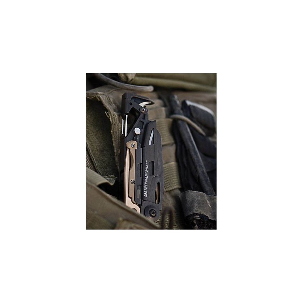 Il MUT Leatherman non è solo uno strumento pratico, ma serve anche per la manutenzione dell'equipaggiamento militare. Infatti, presenta un raschietto in carbonio color bronzo, un punzone di smontaggio e un utensile per far arretrare l’otturatore. Dispone di molteplici punti di fissaggio per spazzole e perni di pulizia filettati, nonché di cacciavite standard e punte Torx per qualsiasi evenienza, dai lavori di regolazione alla riparazione degli ingranaggi. Gli altri strumenti includono pinze, coltello combinato in acciaio 420HC, sega, martello e molto altro.