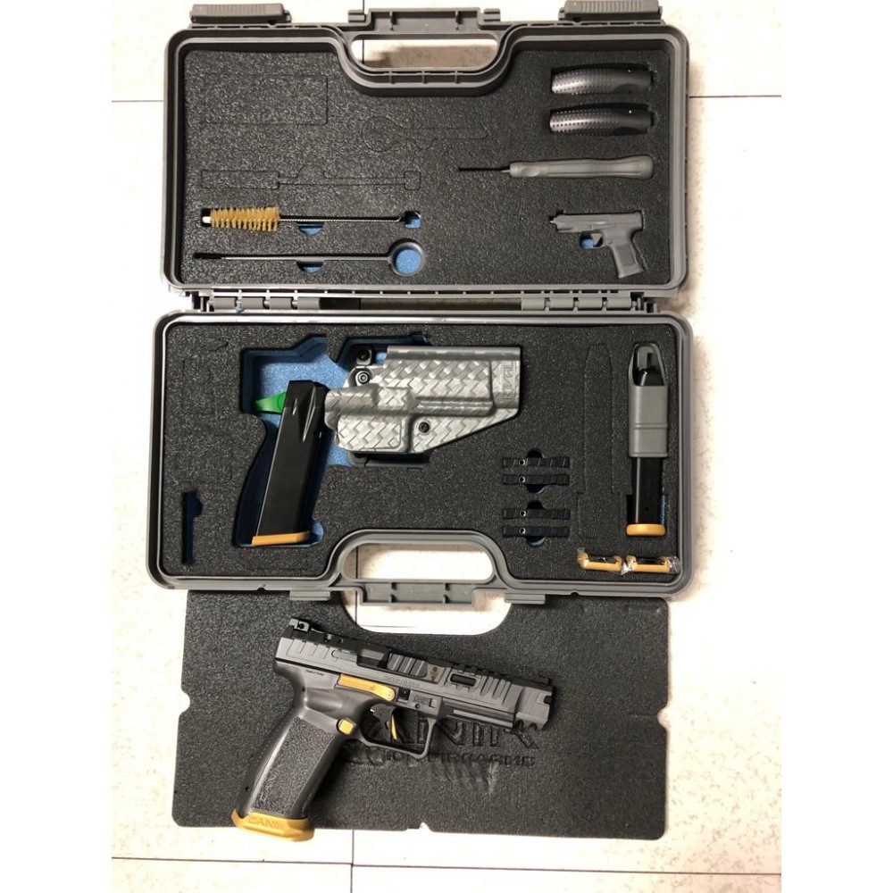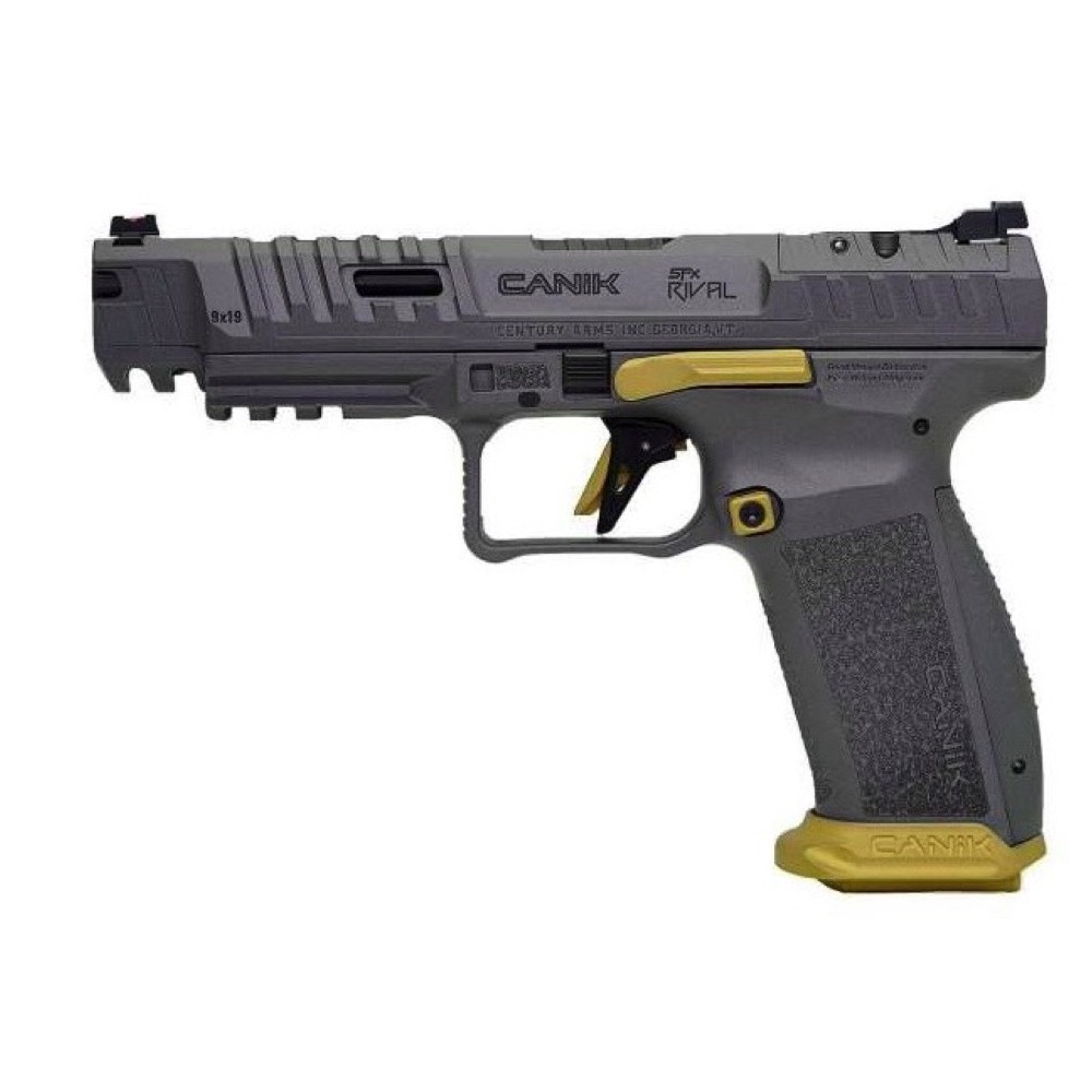 Canik pistola TP9 SFX Rival: Pistola con fusto polimerico, canna da 5", sicura al grilletto, in cal. 9x19, colorazione GRIGIA, con leva hold open, pad caricatori, grilletto e pulsanti sgancio caricatori in color ORO.