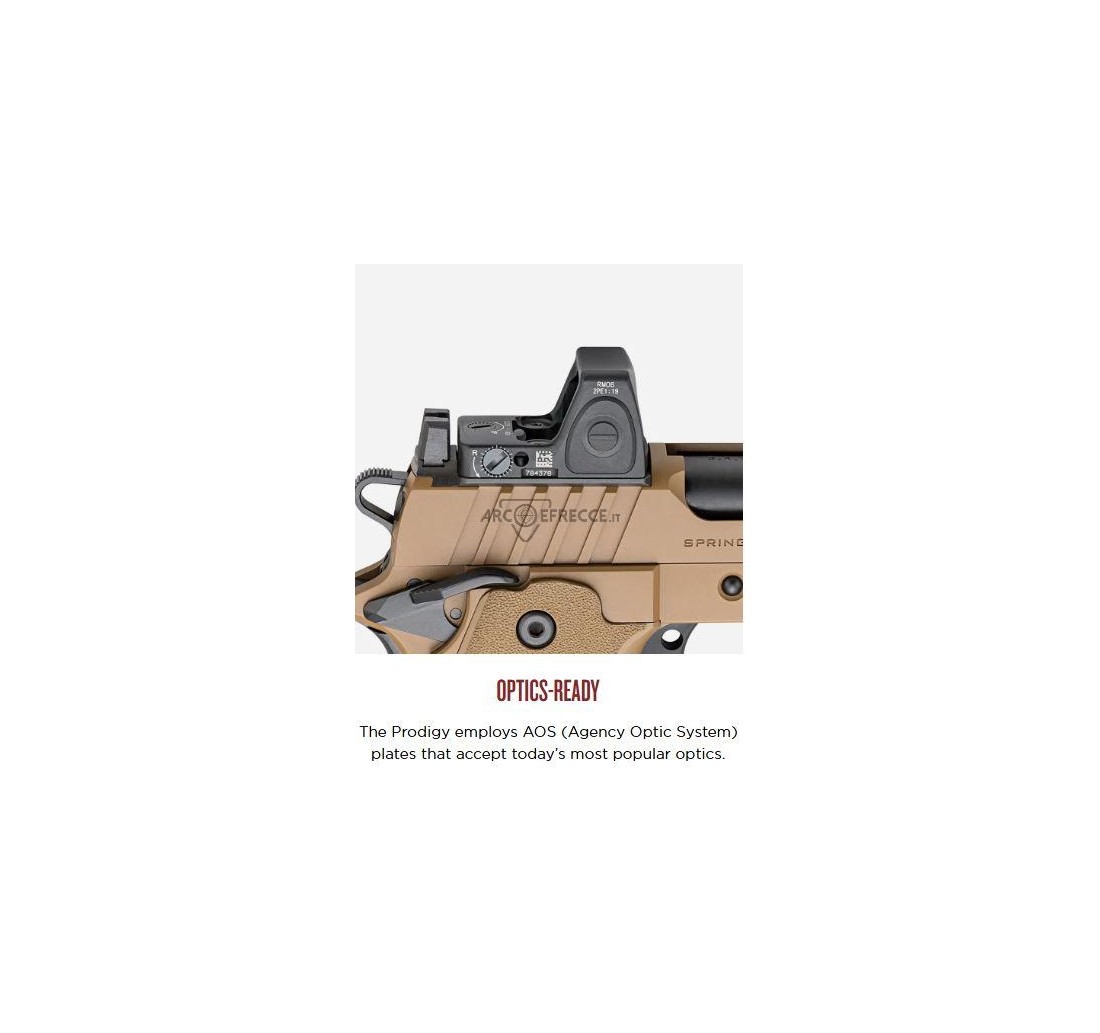 La Prodigy™ di Springfield Armory riprende la collaudata piattaforma 1911 e la migliora con una capacità dippia (caricatore bifilare) e una serie di caratteristiche orientate alle prestazioni. Rifinita in resistente Coyote Brown Cerakote®, la Prodigy presenta un'impugnatura in polimero montata su un telaio in acciaio forgiato, che offre capacità di 17+1 e 20+1. Il caricatore bifilare alimenta una canna bull da 5 pollici con volata da 11° per una precisione match. Predisposta per le ottiche, la Prodigy utilizza piastre AOS (Agency Optic System) con una tacca di mira integrata, che consente un corretto allineamento del mirino e un quadro visivo intuitivo. Ogni Prodigy viene fornita con una piastrina HEX Dragonfly compatibile, mentre altre piastrine specifiche per l'ottica sono disponibili per l'acquisto.