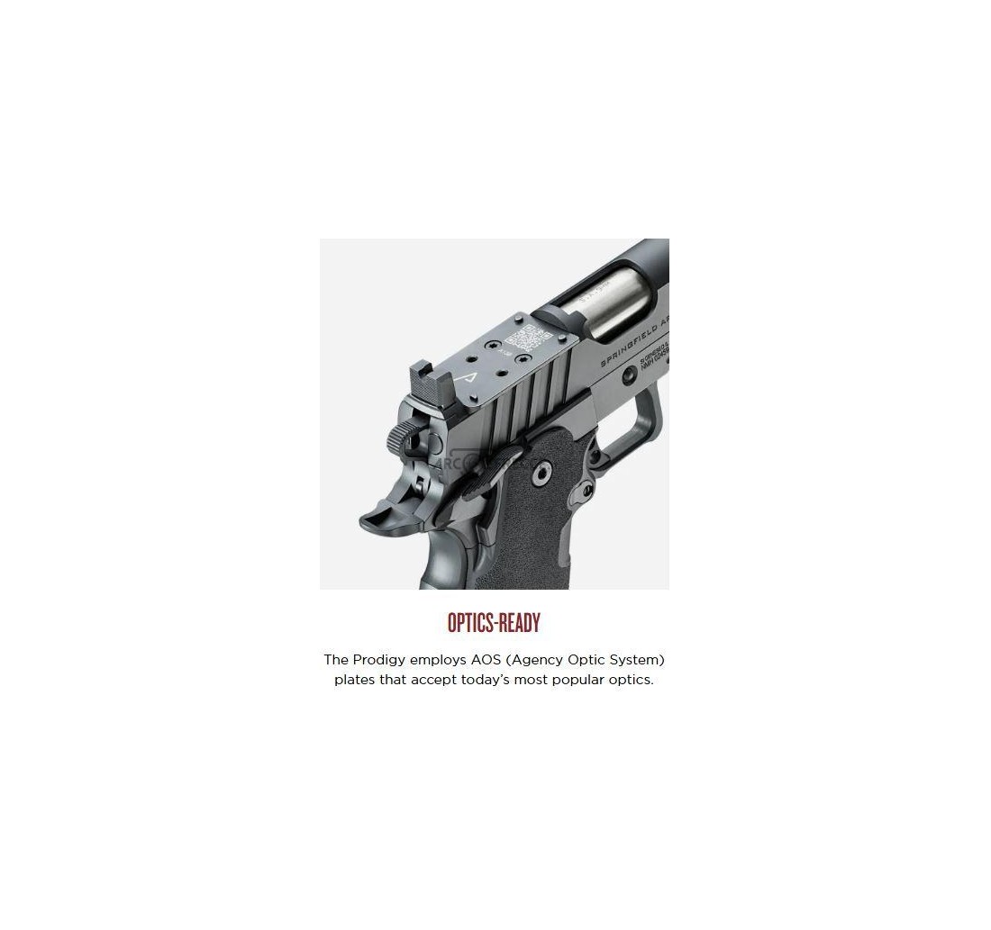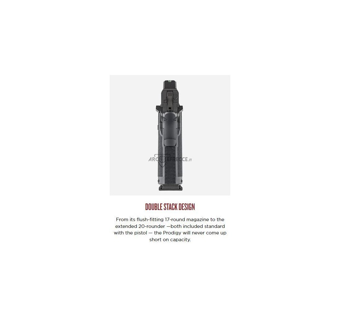 La Prodigy di Springfield Armory riprende la collaudata piattaforma 1911 e la migliora con una capacità doppia (caricatore bifilare) e una serie di caratteristiche orientate alle prestazioni. Riconfigurato attorno a un caricatore bifilare,modulo di impugnatura in polimero del Prodigy si monta sul suo telaio in acciaio forgiato, offrendo capacità di 17+1 e 20+1. Predisposta per l'ottica, con una sicura ambidestra e una slitta Picatinny, la Prodigy combina le caratteristiche più amate della 1911 con una capacità moderna per prestazioni ineguagliabili.