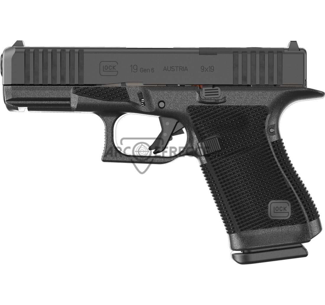 Glock 19 Gen6, G-Match, un nuovo standard nelle armi corte. Nuovo grip RTF6 per avere una presa sempre salda, il fusto presenta una leggera "bombatura" per permettere una presa più confortevole, minigonna accentuata per un cambio caricatore più rapido, undercat sotto la guardia del grilletto per una presa più alta, bevertail posteriore per un controllo migliore in fase di rilevamento, grilletto flat, thumb rest ambidestro per una presa costante dell'arma, protezione della leva blocco carrello maggiorata, intagli di presa frontali e posteriori ridisegnati, sistema optic ready riprogettato per un montaggio di ottiche più basso, asta guidamolla ridisegnata con molla singola e nuovo estrattore.