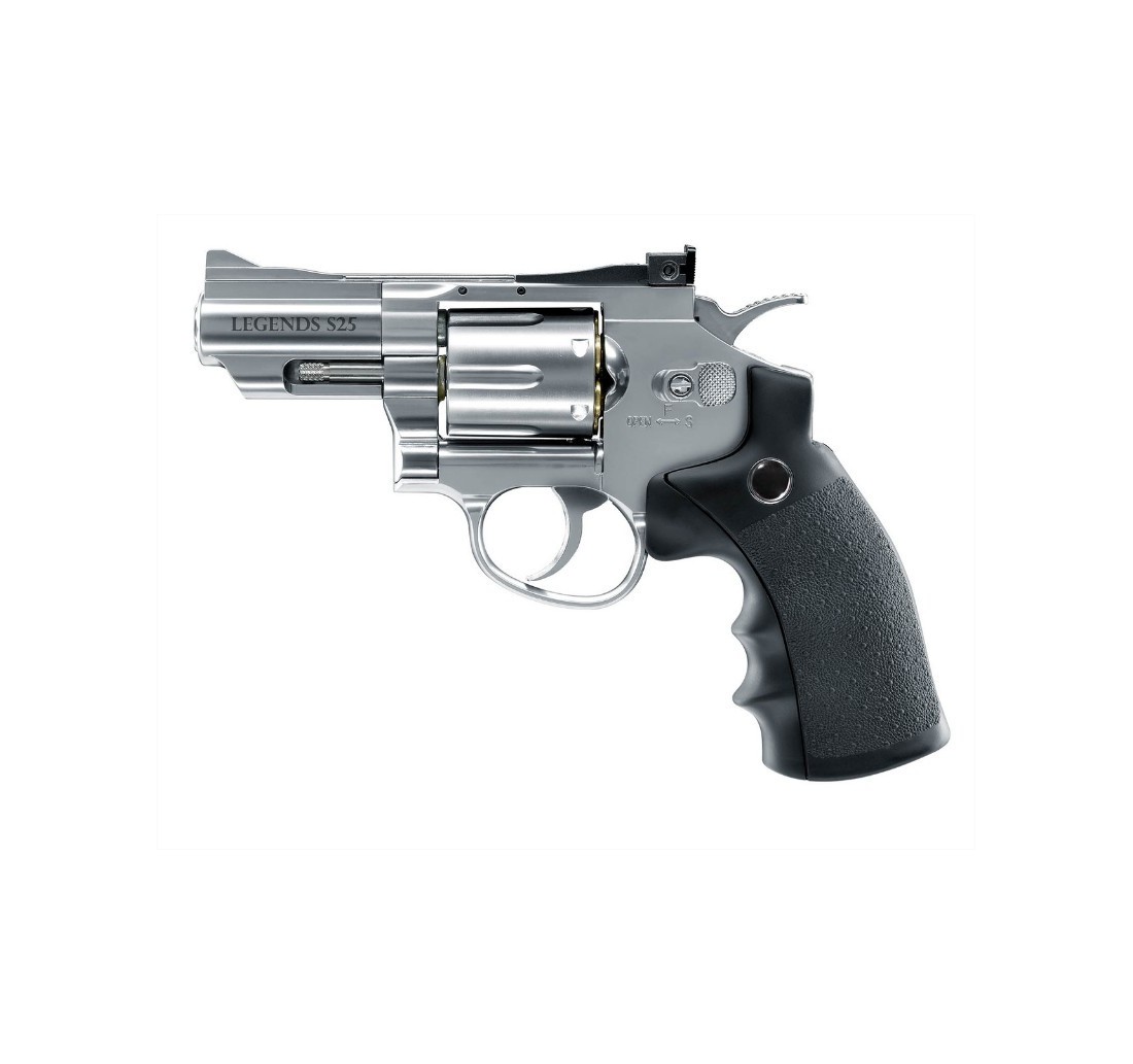 Umarex Legends pistola S25, 2.5" CO2 <7,5 joule, calibro 4,5, realizzata in metallo con guancette in polimero e finitura nichelata lucida.