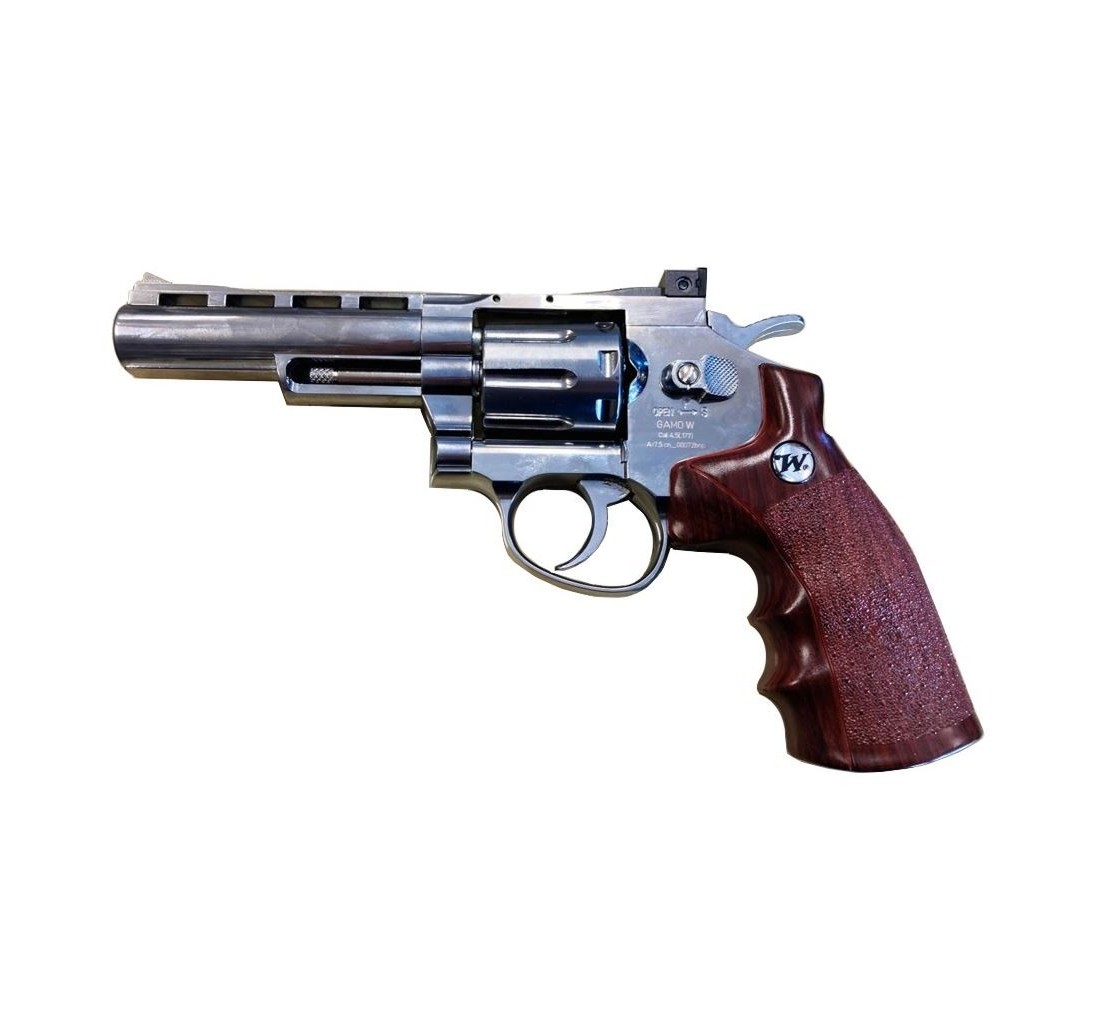 Gamo revolver W, funzionamento CO2, <7,5 joule, calibro 4,5, è il nuovissimo revolver della casa Gamo: realizzata in metallo con guancette effetto legno.