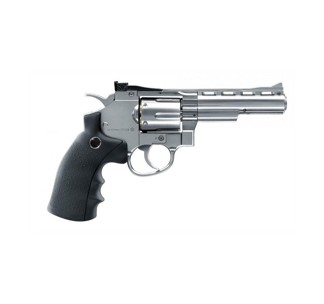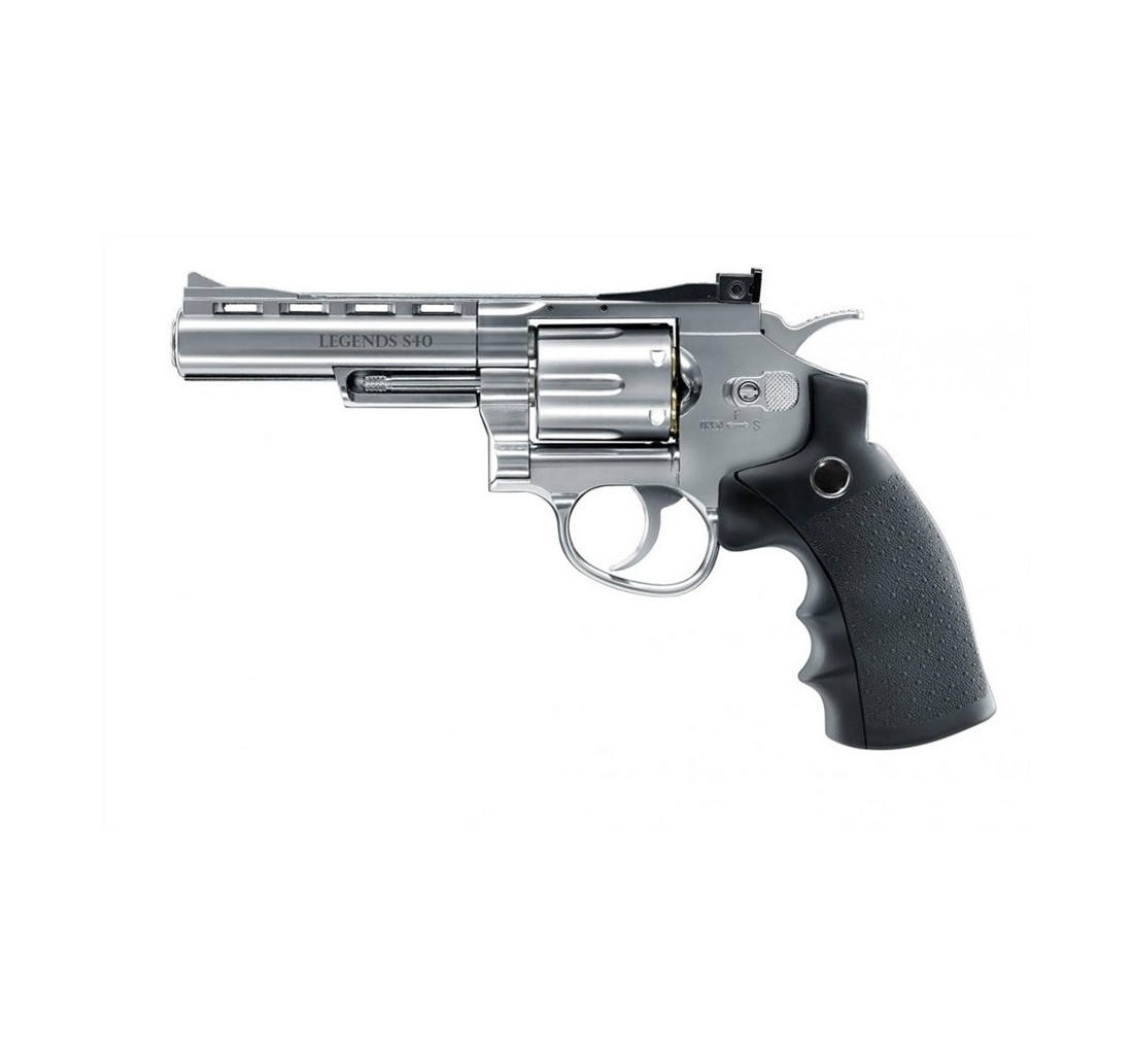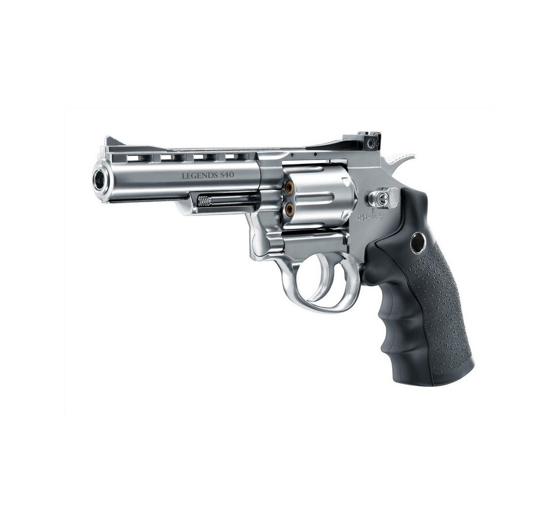 Umarex Legends pistola S40, 4" CO2 <7,5 joule, calibro 4,5, realizzata in metallo con guancette in polimero e finitura nichelata lucida.