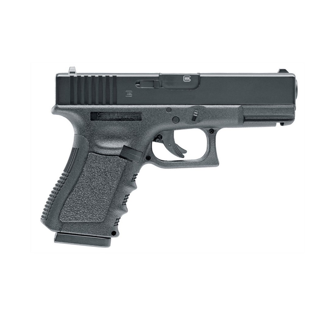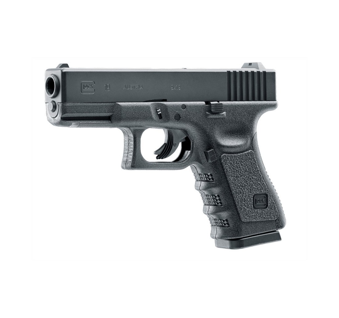 Replica pistola Glock 19 by Umarex, versione CO2, compatta, maneggevole ed estremamente realistica. Con carrello in metallo, semiautomatica, <7,5 joule, calibro 4,5mm.