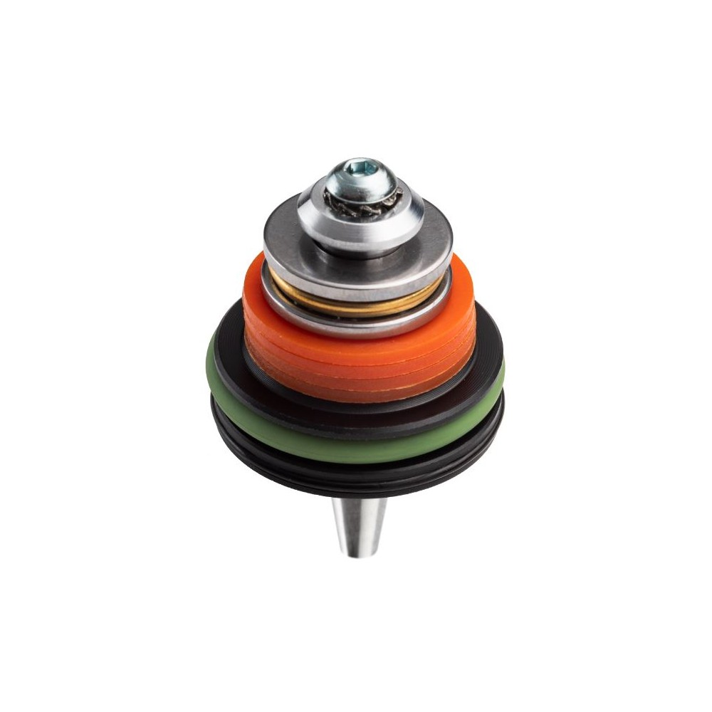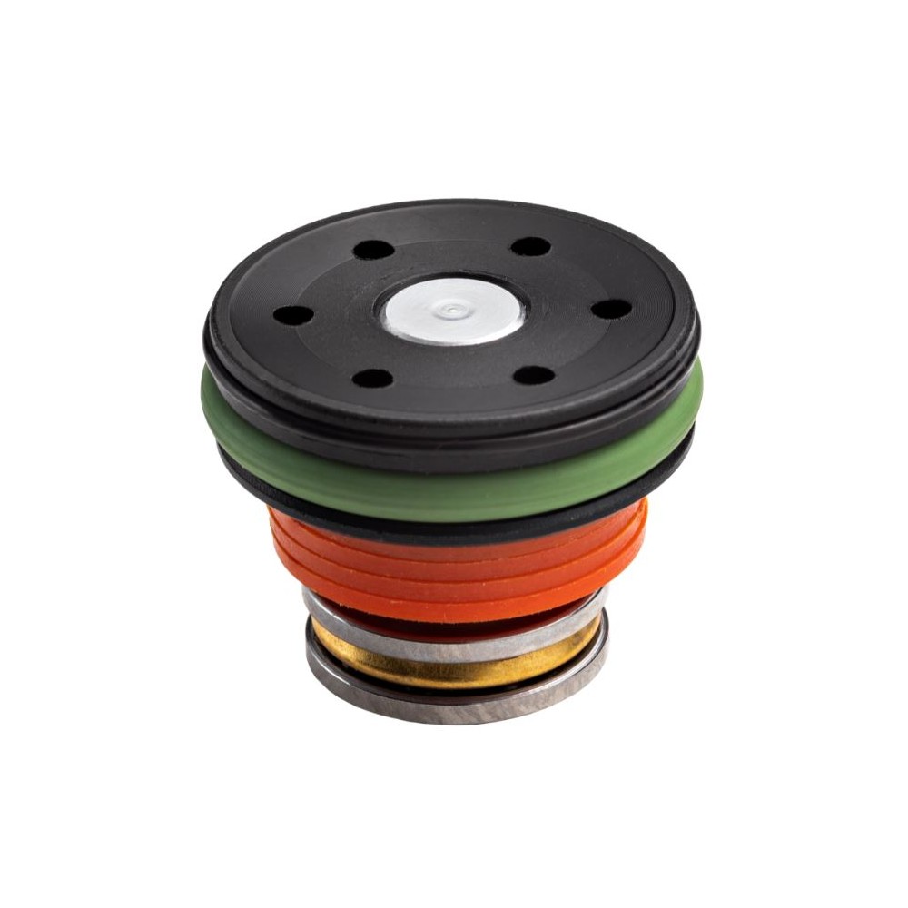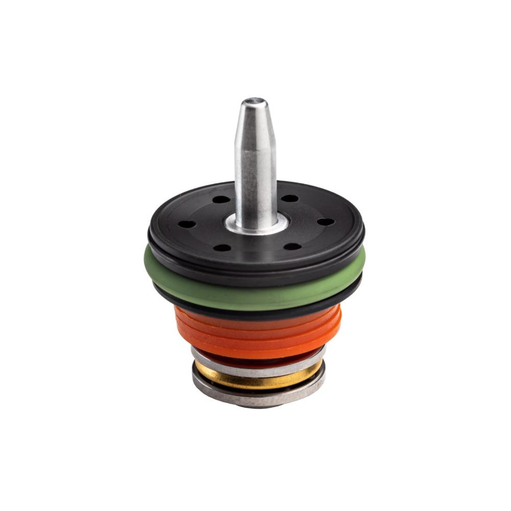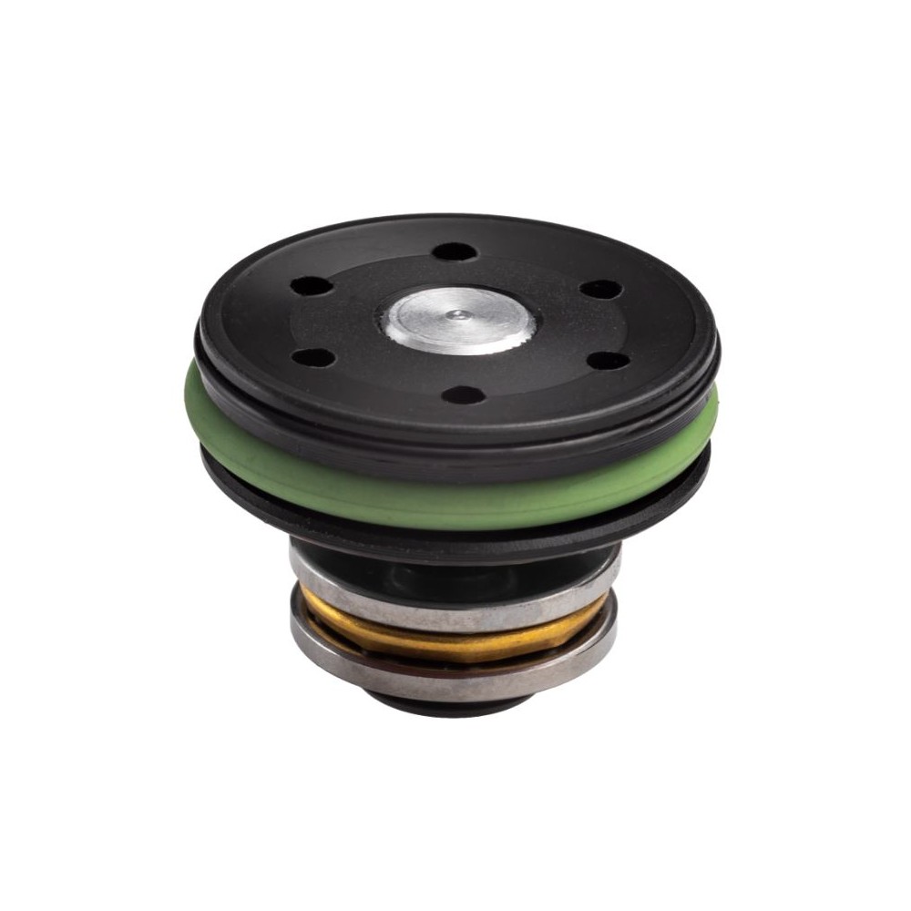 Testa pistone in tecnopolimero caricato con fibra di carbonio, concepita per le raffiche veloci e per aumentare la silenziosità della replica grazie alla ridottissima superficie battente (TPAVPCF). La sua adozione alleggerisce il peso della massa battente composta da pistone e testa pistone con una notevole diminuzione dello stress meccanico e del rumore.La particolare conformazione della parte battente (conica degradante verso il centro) assicura che i fori di ventilazione non vengano mai chiusi dalla gomma di battuta della testa cilindro, senza però lasciare troppa aria ferma tra testa cilindro e testa pistone.