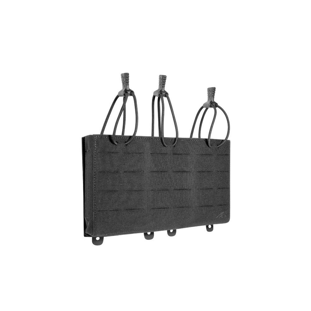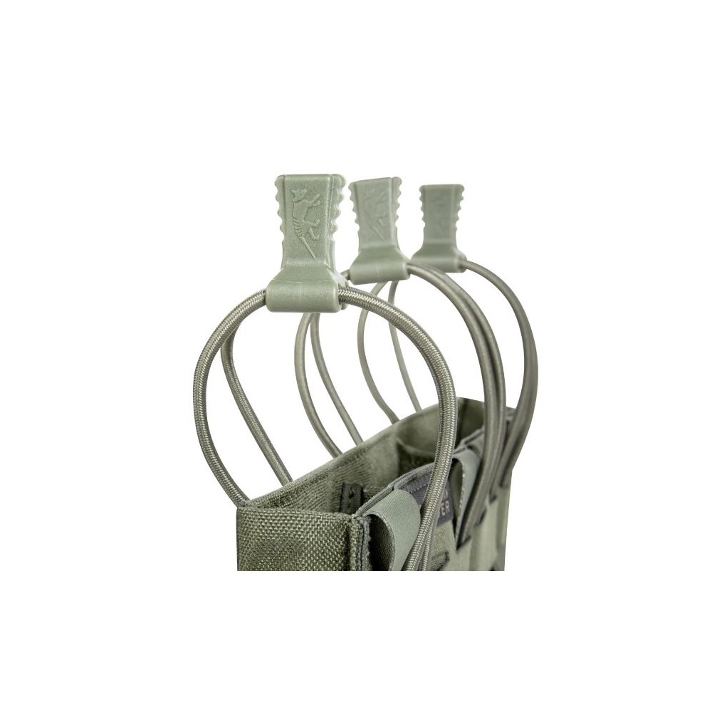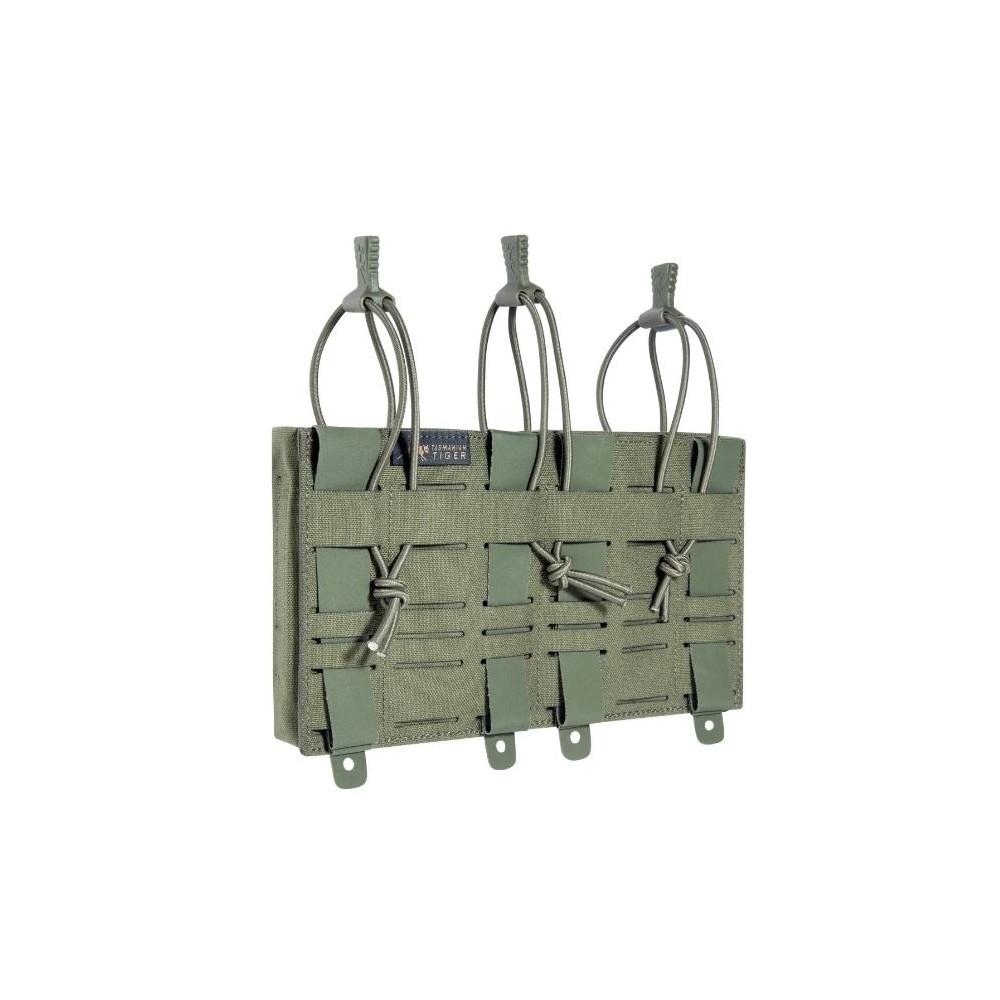 Upgrade del 2024, Tasmanian Tiger porta caricatore triplo dotato di rinforzi in plastica a imbuto sui lati per semplificare l’inserimento e di una chiusura elastica a sgancio rapido con linguetta ergonomica.