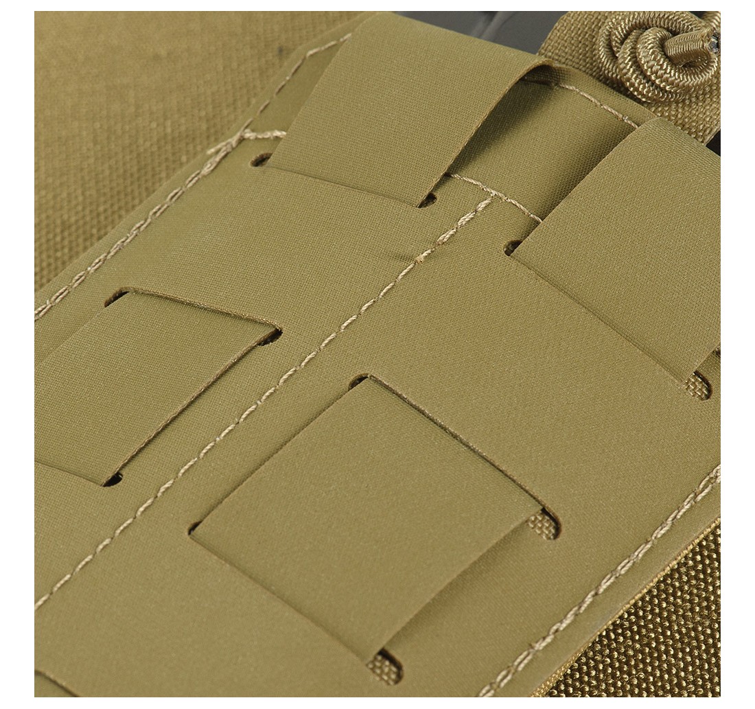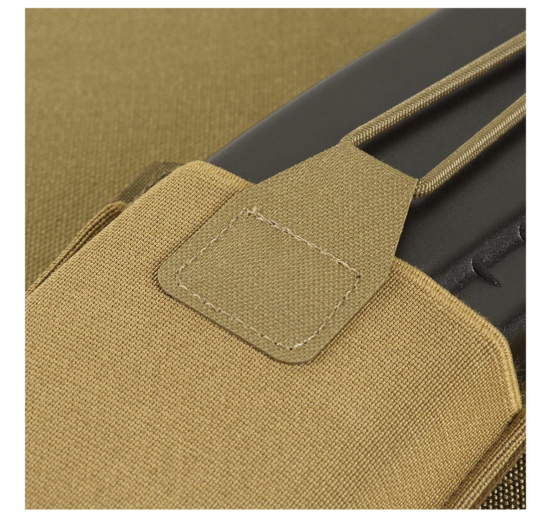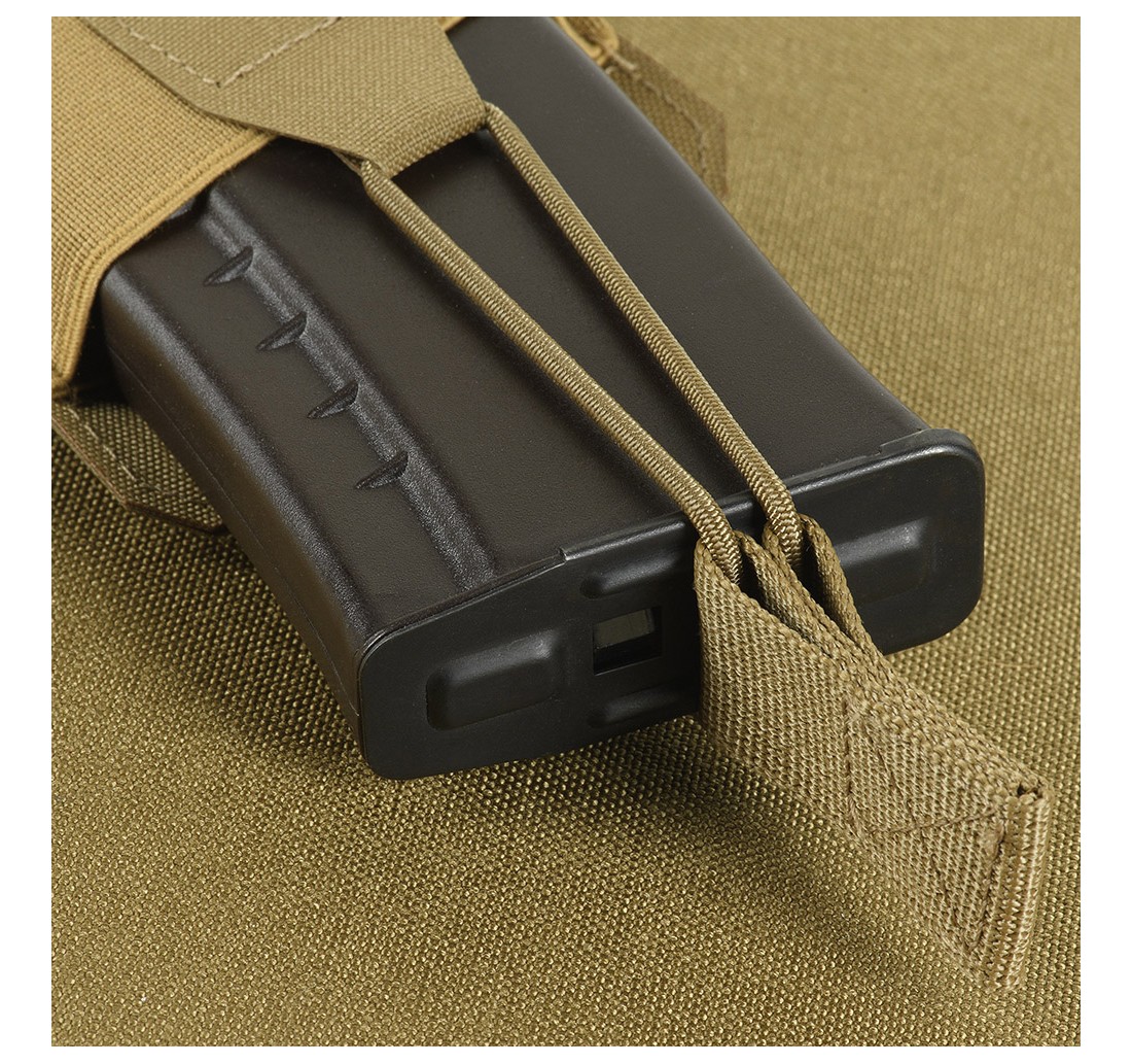 Realizzata in Cordura 500D di alta qualità, un tessuto estremamente resistente all’abrasione e ai carichi elevati. Il fissaggio affidabile è garantito da una cinghia e da un cordino elastico, che offrono protezione contro la caduta del caricatore. Le dimensioni compatte permettono di posizionare facilmente tre o più tasche sull’equipaggiamento, a seconda del tipo di plate carrier utilizzato. Si aggancia facilmente all’equipaggiamento grazie all’interfaccia MOLLE, realizzata in composito polimerico tramite tecnologia di taglio laser.