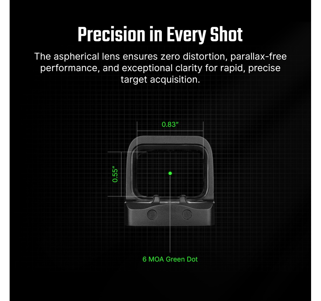 • Punto verde da 6 MOA: Un punto verde da 6 MOA offre un’acquisizione del bersaglio più rapida, una migliore visibilità alla luce del giorno e un allineamento più veloce — ideale per situazioni di forte stress come autodifesa, difesa domestica e uso professionale.