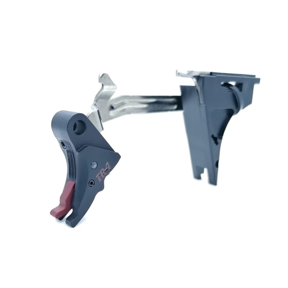 Il Nuovo Grilletto Crocodile™ è completamente in ERGAL lavorato in CNC con sicura Rossa fuoco/Nera opaca. Il pacchetto di scatto, è realizzato con componenti originali Glock (Barra del grilletto - Ejector - Sicura al Percussore - Connettore_ tutti completamente lavorati TR-1).