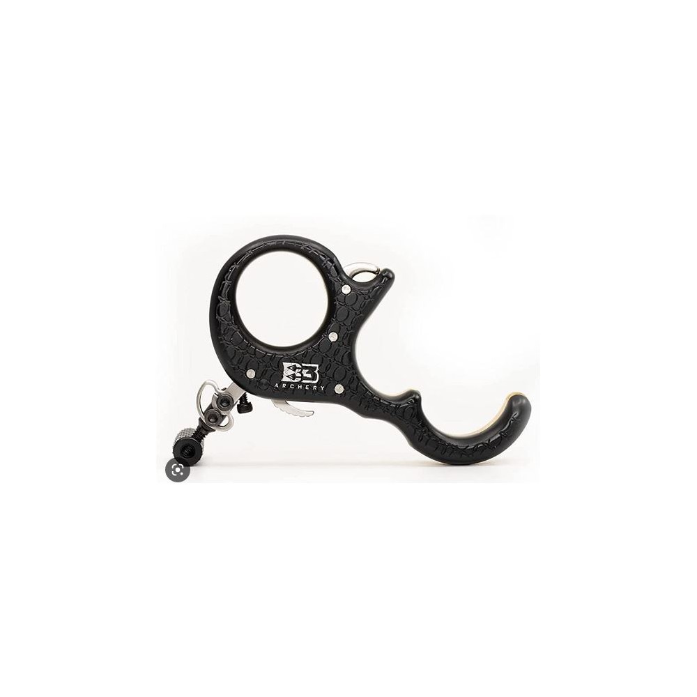 Sgancio a pollice con foro centrale per inserire il dito indice. il guscio esterno è "martellato" per dare una migliore grip alla mano dell'arciere. Ampie possibilità di regolazione sia sul "thumb peg" (appoggio pollice) che sulla corsa e durezza e dello scatto.