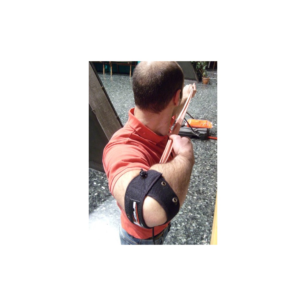 Questa gomitiera è un accessorio di "ausilio didattico". Estremamente facile da utilizzare permette di comprendere rapidamente il corretto uso della schiena nell'apertura dell'arco. Può essere usata anche per riscaldamento o potenziamento. L'elastico da agganciare alla corda non è compreso.